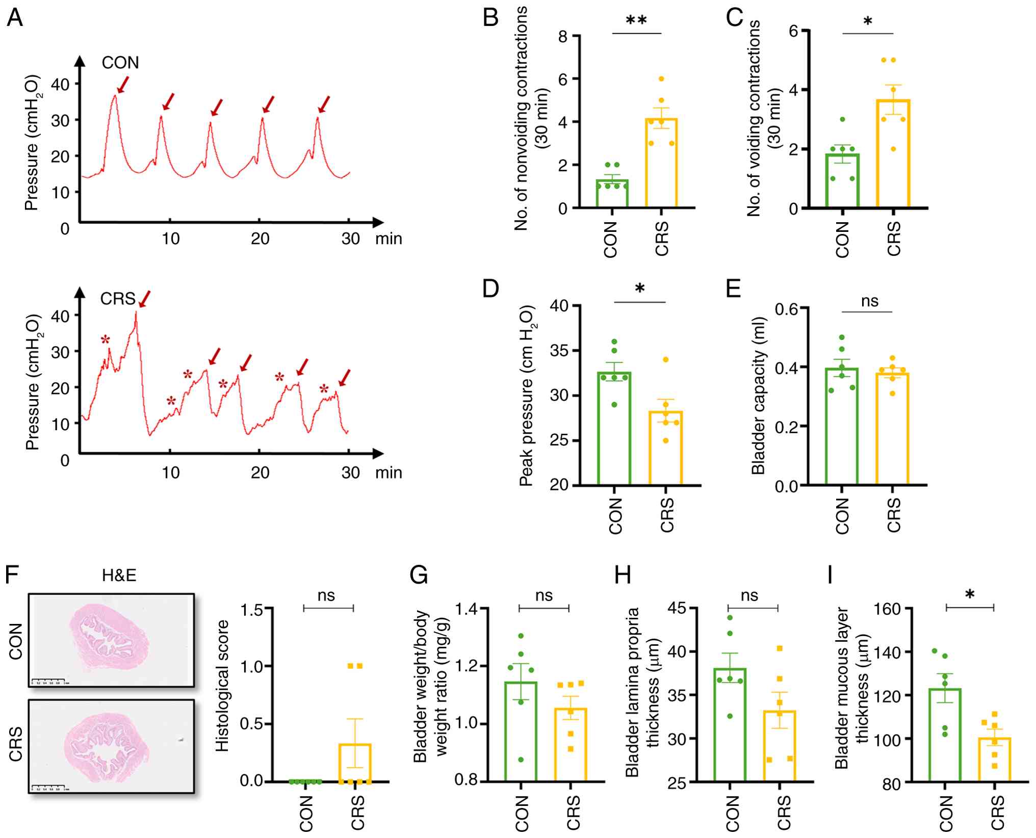 Furthermore, cystometry was conducted to assess bladder function (Fig. 4A) and it was and found that CRS mice had more non-voiding (4.16±0.47 vs. 1.33±0.21), voiding contractions (3.67±0.95 vs. 1.83±0.31) and lower peak pressure (28.33±1.26 vs. 32.67±1.02 cm H2O), whereas bladder capacity was unchanged (0.38±0.02 vs. 0.39±0.03 ml), (Fig. 4B-E). These results indicate that CRS-induced anxiety may cause OAB-like symptoms in mice through involuntary contractions of the detrusor muscle. Subsequently, the present study conducted hematoxylin and eosin staining on bladders and calculated the bladder-to-body weight ratio, finding no difference in bladder-to-body weight ratio or lamina propria thickness between groups, mirroring human OAB (31) (Fig. 4F-H). The bladder mucosal layer was thinner in CRS mice compared with controls (Fig. 4I), suggesting that mucosal layer changes might contribute to OAB symptoms.