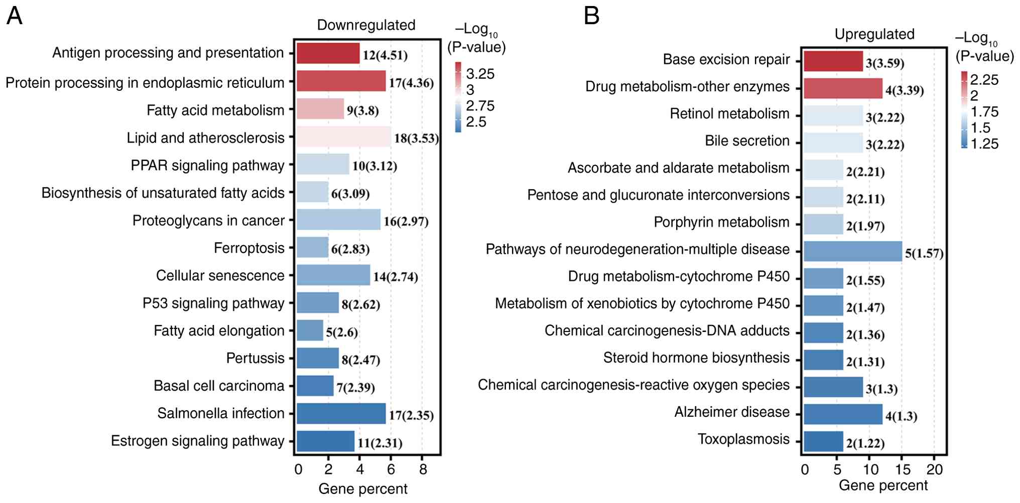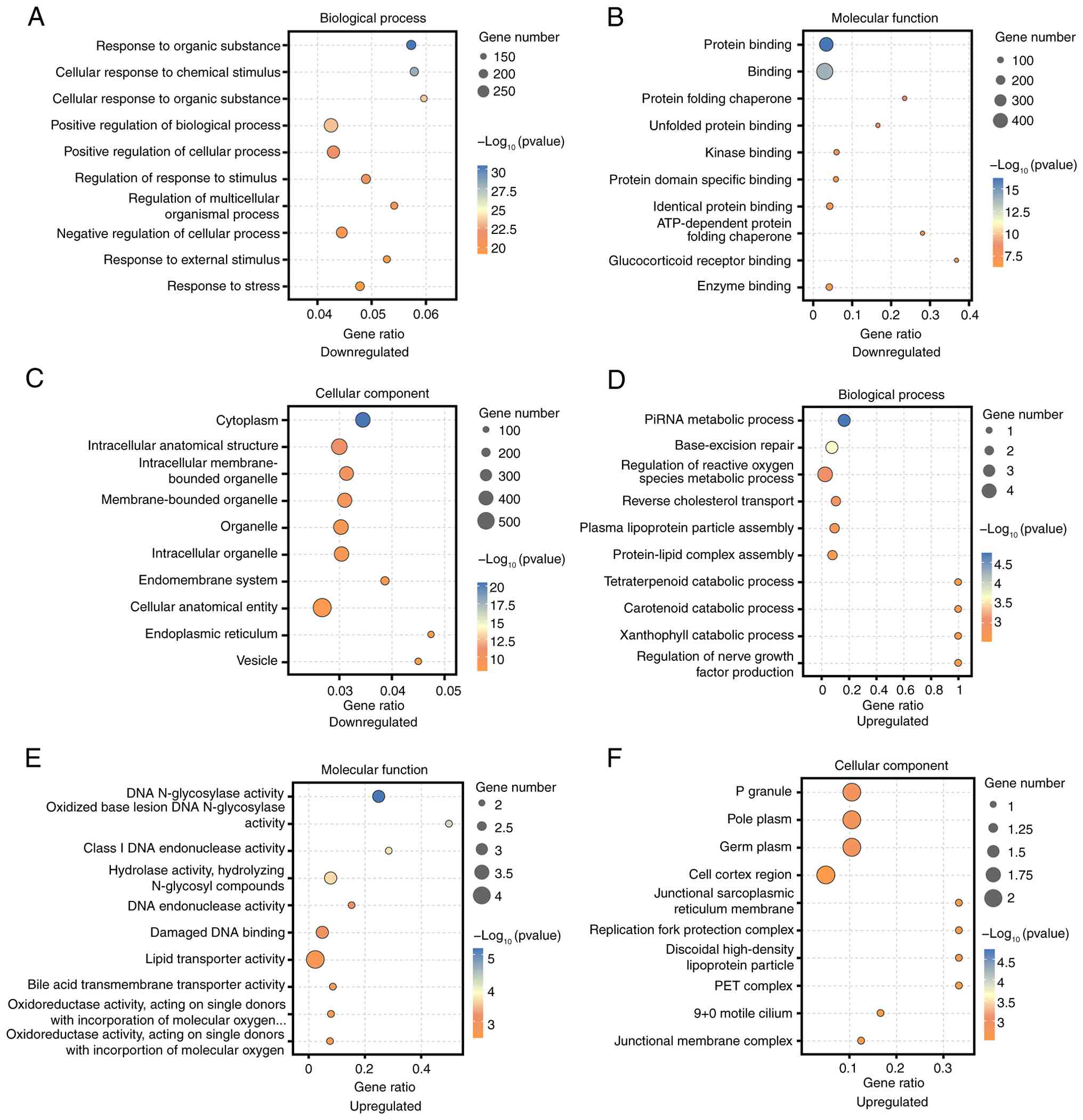 GO analysis identified the most enriched categories among downregulated DEGs as ‘positive regulation of biological process’, ‘Binding’, and ‘Cellular anatomical entity’ (Fig. 5A-C). For upregulated DEGs, the top categories were ‘Regulation of reactive oxygen species metabolic process’, ‘lipid transporter activity’, and ‘P granule’ (Fig. 5D-F). KEGG pathway analysis revealed ‘Antigen processing and presentation’ as the most markedly associated with downregulated DEGs (Fig. 6A), while ‘Base excision repair’ was most significant for upregulated DEGs (Fig. 6B).