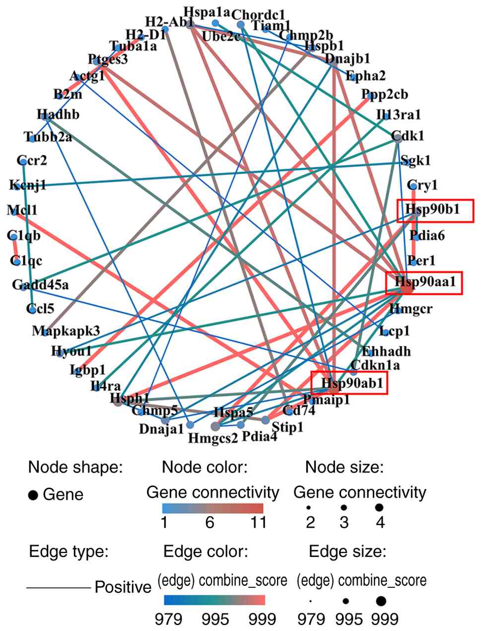 The PPI network comprised 50 nodes and 533 edges (Fig. 7). The top three hub genes, identified by combined score, were Hsp90aa1, Hsp90ab1, and Hsp90b1, all from upregulated DEGs.