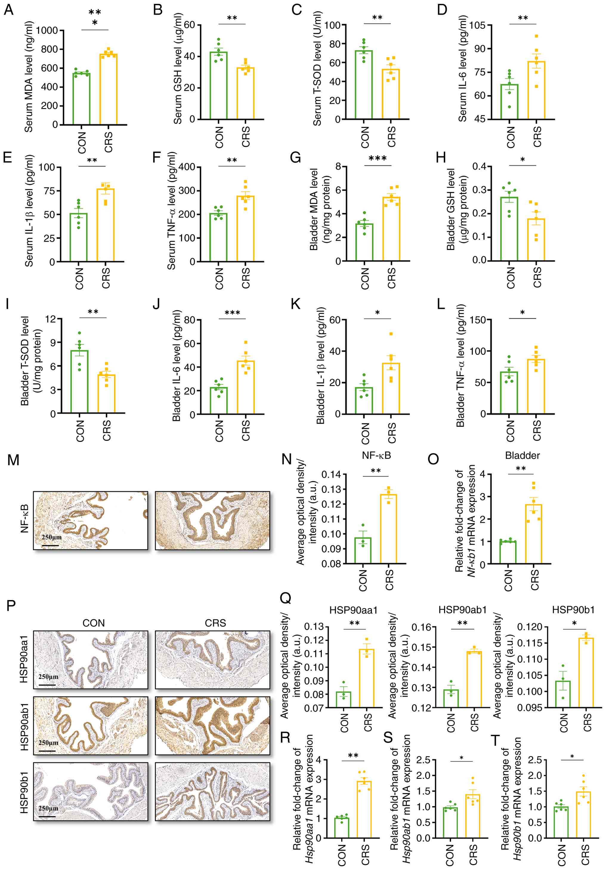 To further verify the status of NF-κB in the bladder, the gene and protein expression of NF-κB in the bladder of each group were examined and the results showed that the gene expression of Nf-κb1 and the protein expression levels of NF-κB as well as IL-6, IL-1β and TNF-α were markedly increased in the CRS group compared with the control group (Fig. 8M-O). These findings might indicate that anxiety could trigger the NF-κB pathway through oxidative stress and pro-inflammatory mediators, causing bladder overactivity.