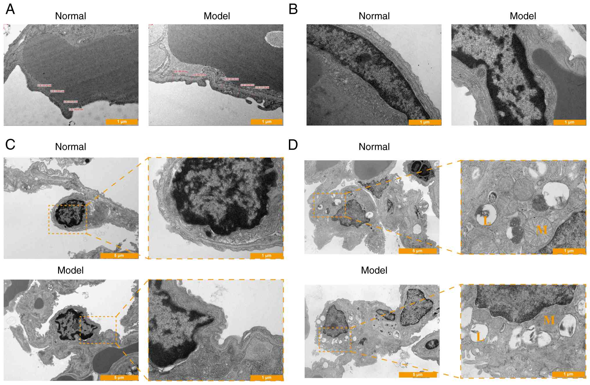 AT II had a clear structure in normal rats, with neatly arranged villi, abundant lamellar bodies, numerous mitochondria and well-defined mitochondrial ridges. Conversely, in model rats, the structure of AT II was unclear, with lamellar bodies detaching in the form of vacuoles and decreasing in number. Additionally, mitochondria showed signs of pyknosis or swelling, and the mitochondrial ridges appeared blurred (Fig. 2D).