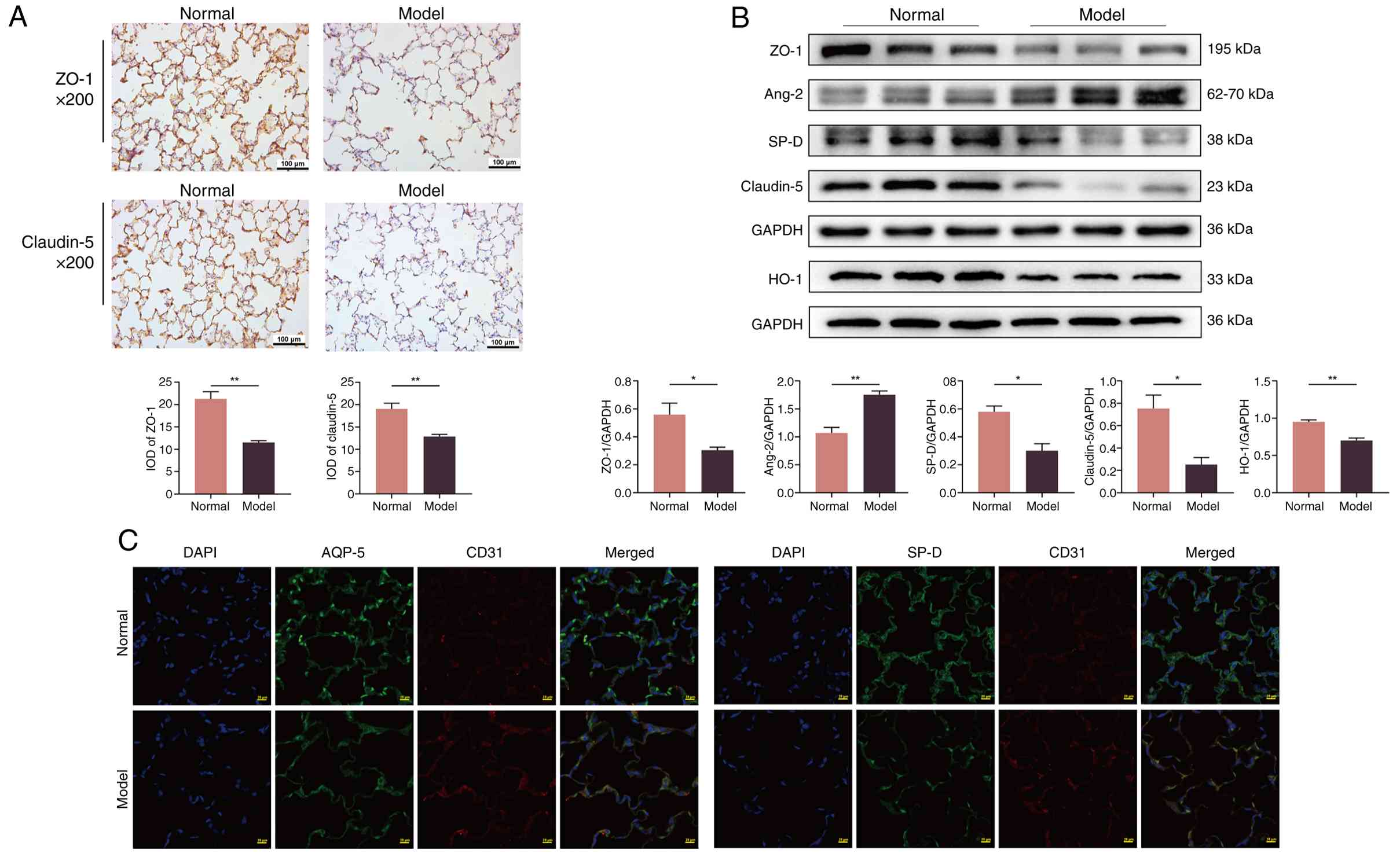 The fluorescence intensity of AQP-5 and SP-D markedly decreased in COPD rats compared with the normal group, while that of CD31 increased notably (Fig. 3C). Furthermore, the protein expression of SP-D (P<0.05) and heme oxygenase-1 (P<0.01) significantly decreased, and the expression of Ang-2 increased significantly (P<0.01) in COPD rats compared with normal rats (Fig. 3B). These findings indicated a significant decrease in the function of the air-blood barrier in COPD rats compared with normal rats.