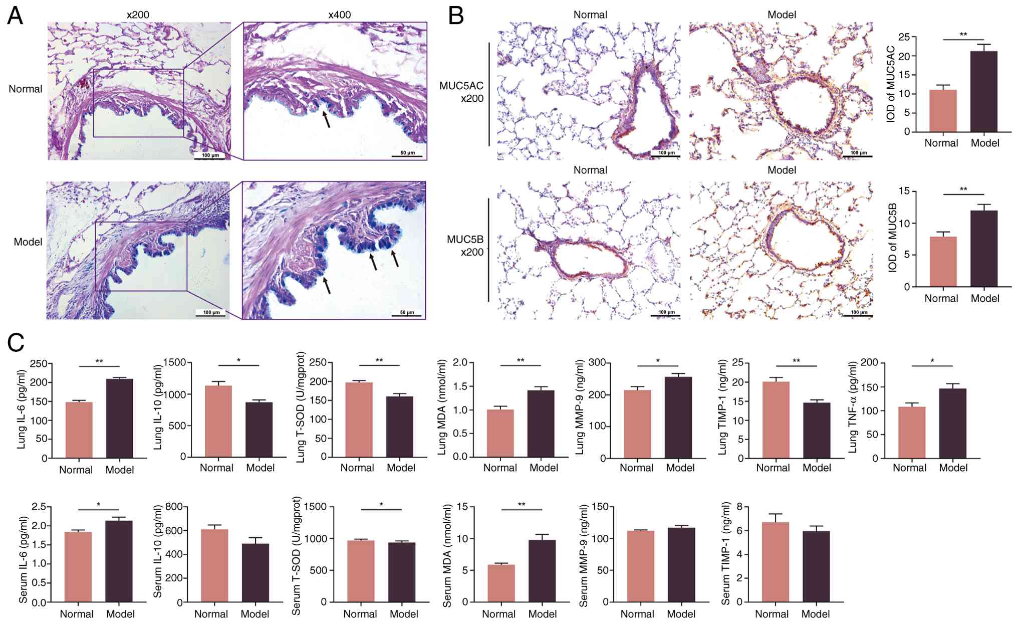 In COPD rats, positive AB-PAS staining markedly increased in the airways compared with normal rats, indicating goblet cell proliferation (Fig. 4A). The expression of MUC5AC and MUC5B was significantly elevated in COPD rats compared with normal rats (Fig. 4B). COPD rats also exhibited an inflammatory response induced by cigarette smoke and bacterial infection. When compared with normal rats, the secretion of IL-6 and TNF-α significantly increased in the lung tissue and serum of COPD rats (P<0.05 and P<0.01), while that of IL-10 decreased significantly in the lung tissue of COPD rats (P<0.05). Similarly, the expression of MMP-9 increased and TIMP-1 decreased significantly in the lung tissue of COPD rats (P<0.05 and P<0.01), indicating abnormal extracellular matrix deposition and the disruption of organizational structure.