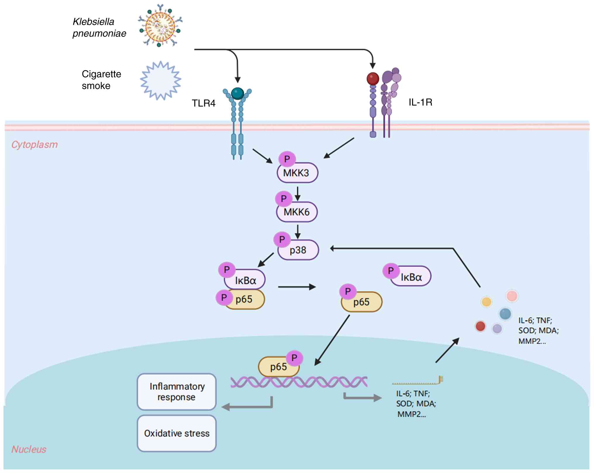Summarily, in the present study, a COPD rat model was established through cigarette smoke inhalation and repetitive bacterial infection. The pulmonary function and histopathology of pulmonary tissues deteriorated in COPD model rats. The ultrastructure of the air-blood barrier was compromised and the structure and function of ATs and PCECs were impaired. Furthermore, the secretion of inflammatory factors and mucus increased in model rats due to cigarette smoke and bacterial infection. Similarly, a protease/antiprotease imbalance and oxidative stress were observed in COPD rats, resulting in damage to the lung air-blood barrier. In summary, the function and structure of the air-blood barrier were impaired in COPD model rats due to cigarette smoke inhalation and repetitive bacterial infection, with underlying mechanisms likely related to inflammation and oxidative stress regulated by the MAPK/NF-κB/IκBα signaling pathway (Fig. 6).