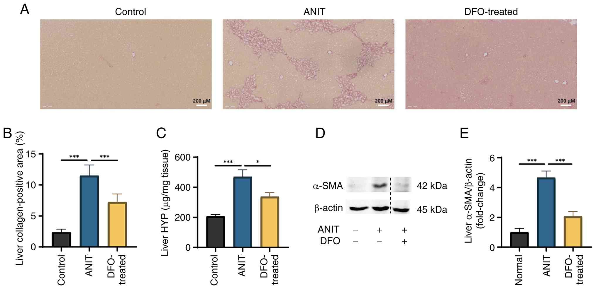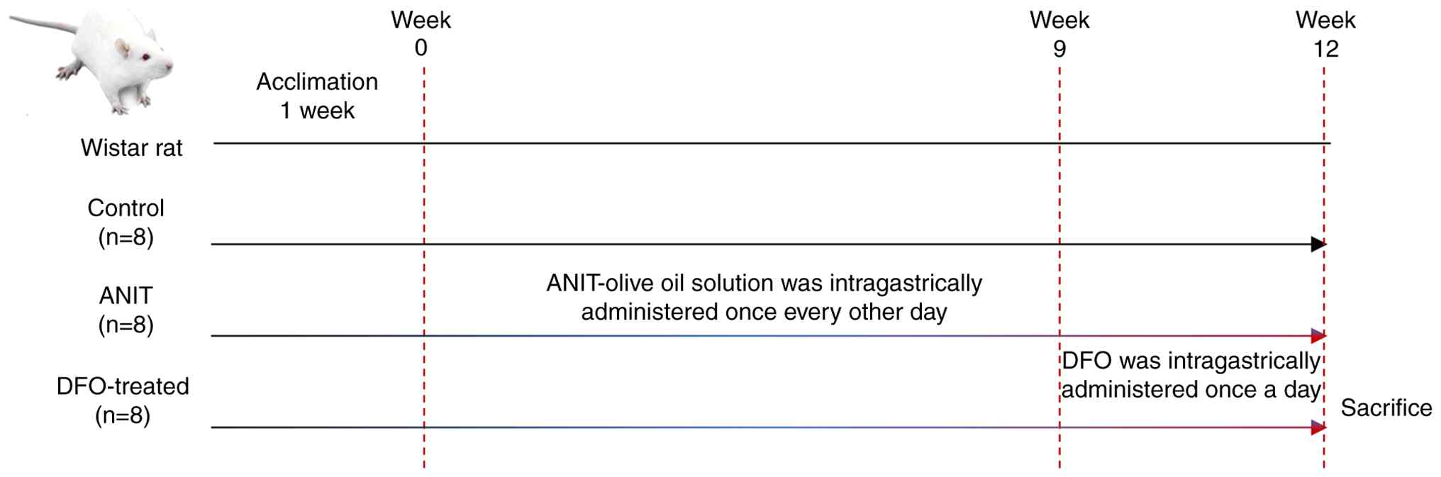 The control group received daily intragastric administration of an equivalent volume of olive oil (3 ml/kg) and standard laboratory chow diet. The model group received intragastric administration of a 2% ANIT (Sigma-Aldrich; Merck KGaA)-olive oil solution (3 ml/kg) every other day (27) for 12 weeks. From week 9, the model group was subdivided into the ANIT (n=8) and DFO-treated (n=8) groups. The DFO-treated group received daily DFO treatment (MedChemExpress; 100 mg/kg) (28) for 4 weeks (weeks 9–12). All animals were sacrificed at the end of week 12 (Fig. 1).