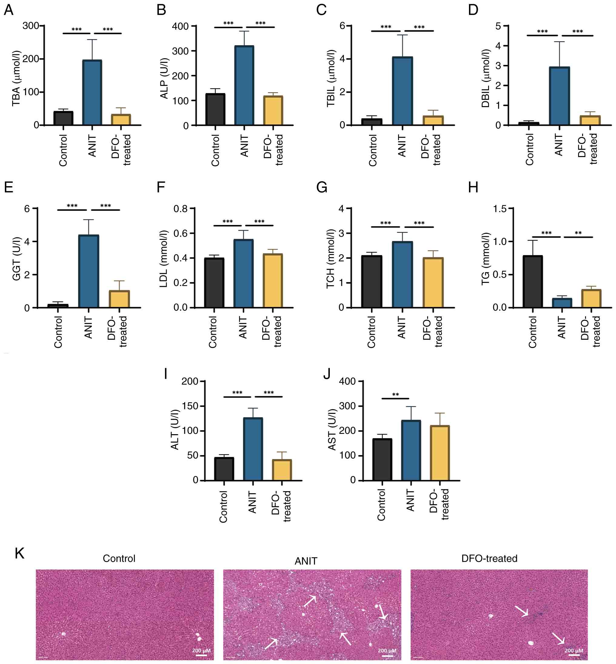 ANIT-induced cholestasis led to significant increases in serum ALT, AST, ALP and GGT activities, and TBIL, DBIL, TBA, TCH and LDL levels, whereas TG levels were significantly decreased compared with those in the control group (Fig. 2A-J). DFO significantly restored serum ALT, ALP and GGT activities, and TBIL, DBIL, TBA, TCH, LDL and TG levels, compared with those in the ANIT group. H&E staining revealed bile duct hyperplasia and inflammatory cell infiltration in the portal area of rats in the ANIT group, which were markedly inhibited by DFO treatment (Fig. 2K).