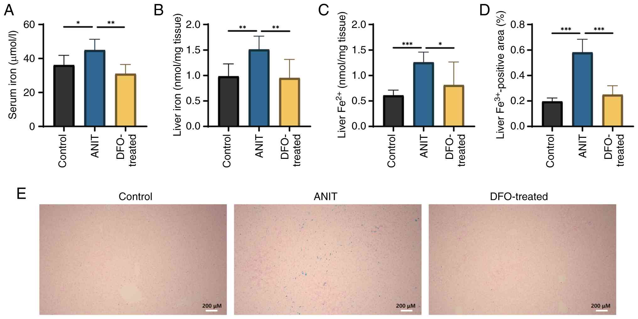 Serum total iron, liver total iron and Fe2+ content were significantly elevated in rats with ANIT-induced cholestasis compared with those in the control group; however, DFO treatment significantly decreased these levels compared with those in the ANIT group (Fig. 4A-C). Furthermore, DFO treatment significantly reduced hepatic iron deposition, as evidenced by the decreased positive Prussian blue staining area ratio (Fig. 4D). Prussian blue staining revealed extensive blue staining in the liver of rats with chronic cholestasis, indicating increased iron deposition (Fig. 4E).