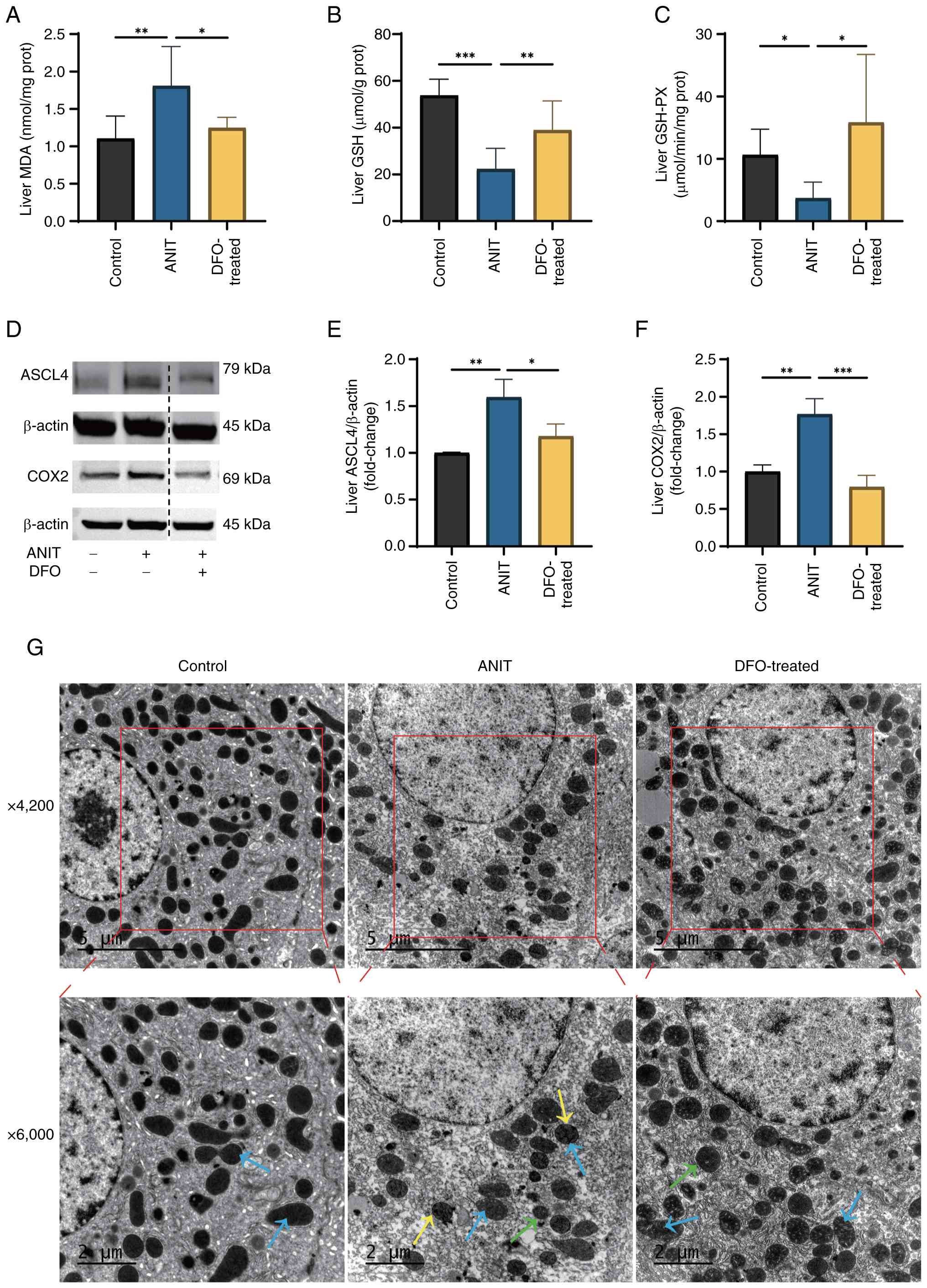 In rats with ANIT-induced cholestasis, liver MDA levels were significantly increased, whereas GSH content and GSH-PX activity were significantly decreased, compared with those in the control group (Fig. 5A-C). DFO treatment, through its iron-chelating action, notably restored liver GSH-PX activity and MDA and GSH levels compared with those in the ANIT group. Furthermore, the protein expression levels of ASCL4 and COX2 were significantly elevated in the liver of rats with ANIT-induced cholestasis compared with those in the control group (Fig. 5D-F). By contrast, DFO treatment significantly reversed the aberrant expression of these aforementioned ferroptosis markers compared with those in the ANIT group. Transmission electron microscopy revealed that hepatocytes from rats with chronic cholestasis exhibited intact nuclei but characteristic mitochondrial abnormalities, including reduced size, blurred and fused cristae, and increased bilayer membrane density (Fig. 5G). By contrast, DFO-treated rats exhibited intact hepatocyte nuclei and morphologically normal mitochondrial cristae. Furthermore, the mitochondrial size in the DFO group appeared increased compared with that in the ANIT group, indicating a partial restoration of mitochondrial morphology towards a normal state.