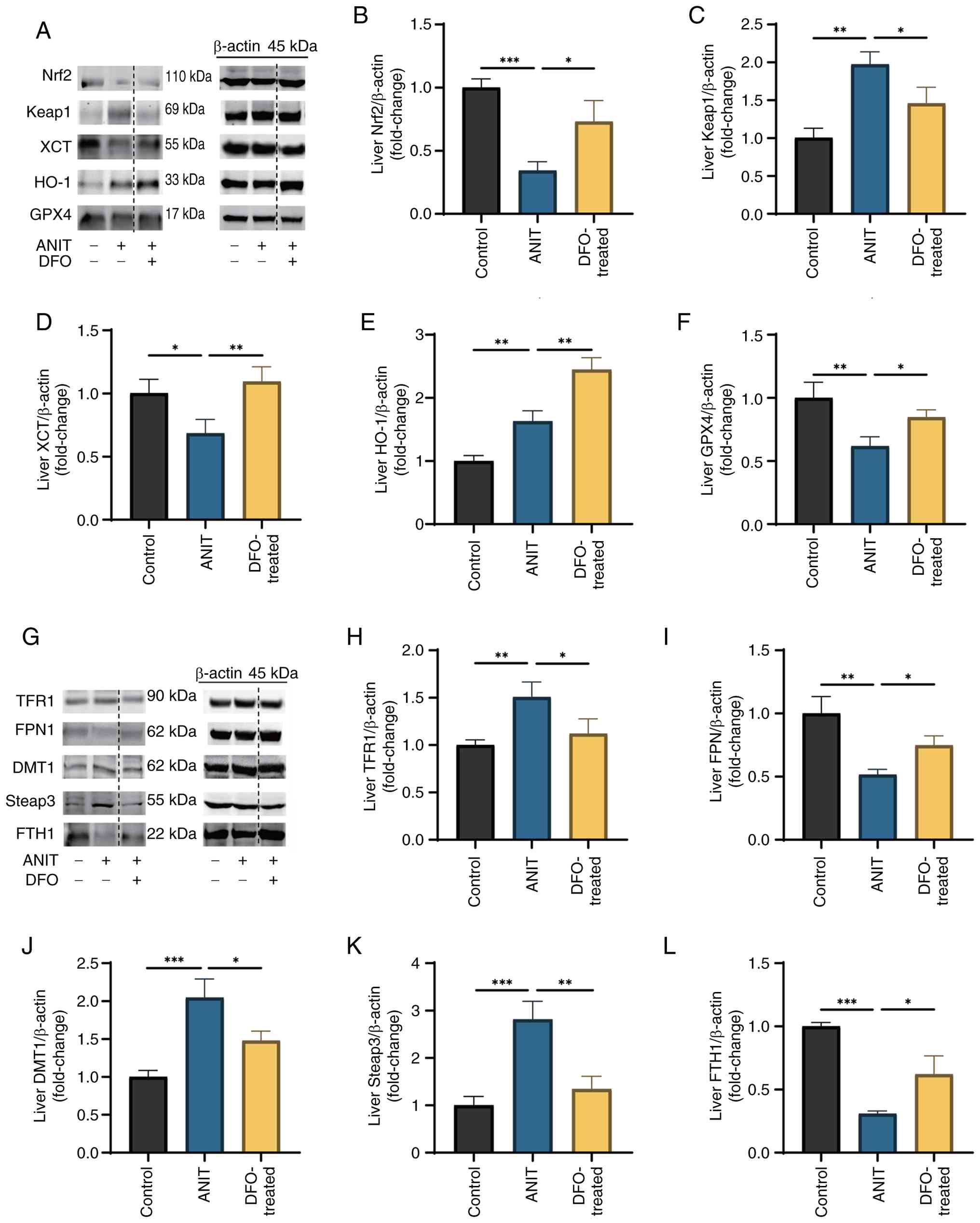 In rats with ANIT-induced cholestasis, liver protein expression levels of Nrf2, XCT and GPX4 were significantly reduced, whereas those of Keap1 and HO-1 were increased, compared with those in rats in the control group (Fig. 6A-F). DFO treatment notably increased the expression of Nrf2, XCT and GPX4, decreased Keap1 expression and further enhanced HO-1 expression. Similarly, the protein expression levels of liver FPN1 and FTH1 were significantly decreased, whereas those of TFR1, DMT1 and Steap3 were elevated in cholestasis-affected rats (Fig. 6G-L). DFO treatment effectively normalized these disruptions in the expression of iron metabolism-related proteins.