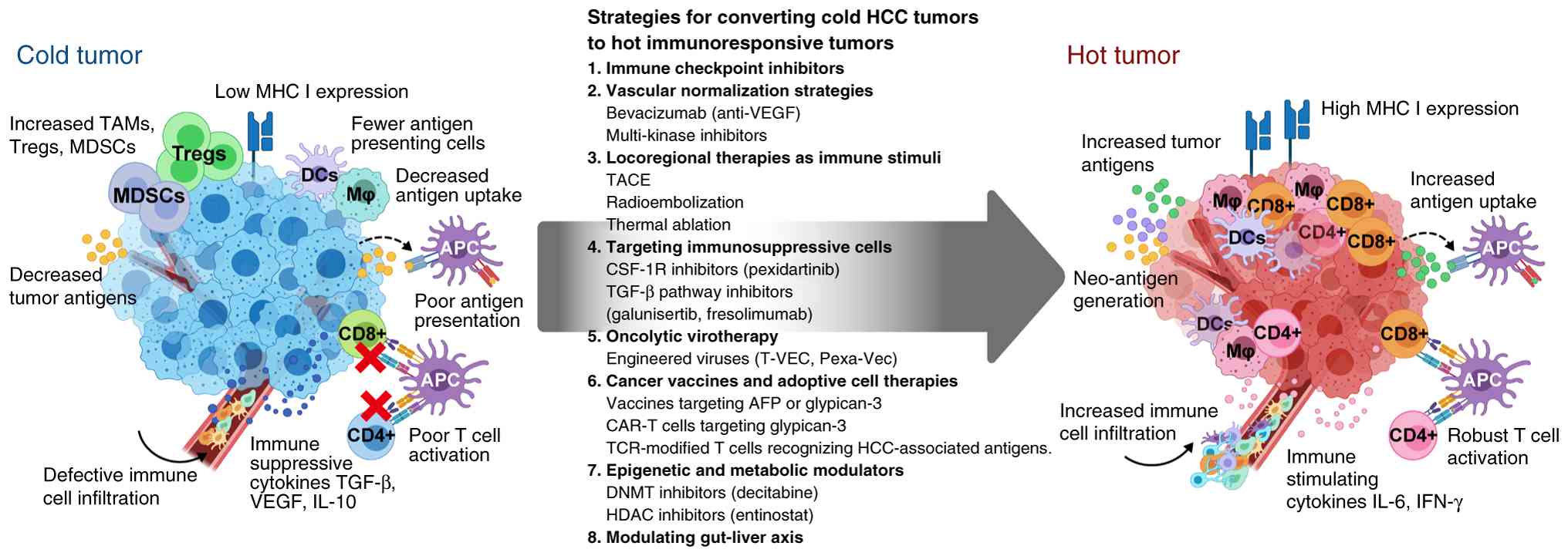Converting an immunologically cold HCC into a hot tumor is a promising strategy to overcome immune resistance and improve patient responses. In the present review, a condensed overview of the HCC tumor immune landscape is provided and the mechanisms underlying its immunologically cold phenotype, including the roles of various immune cells, cytokines and tumor-intrinsic pathways in suppressing antitumor immunity are presented. The established and emerging therapeutic strategies aimed at reprogramming the HCC microenvironment to a more inflamed, T-cell-permissive state are also discussed.
