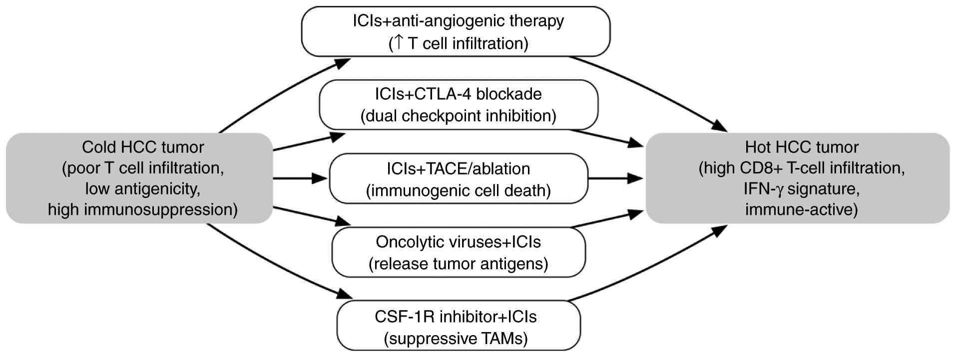 Converting ‘cold’ to ‘hot’ hepatocellular carcinoma for improved immunotherapy (Review)