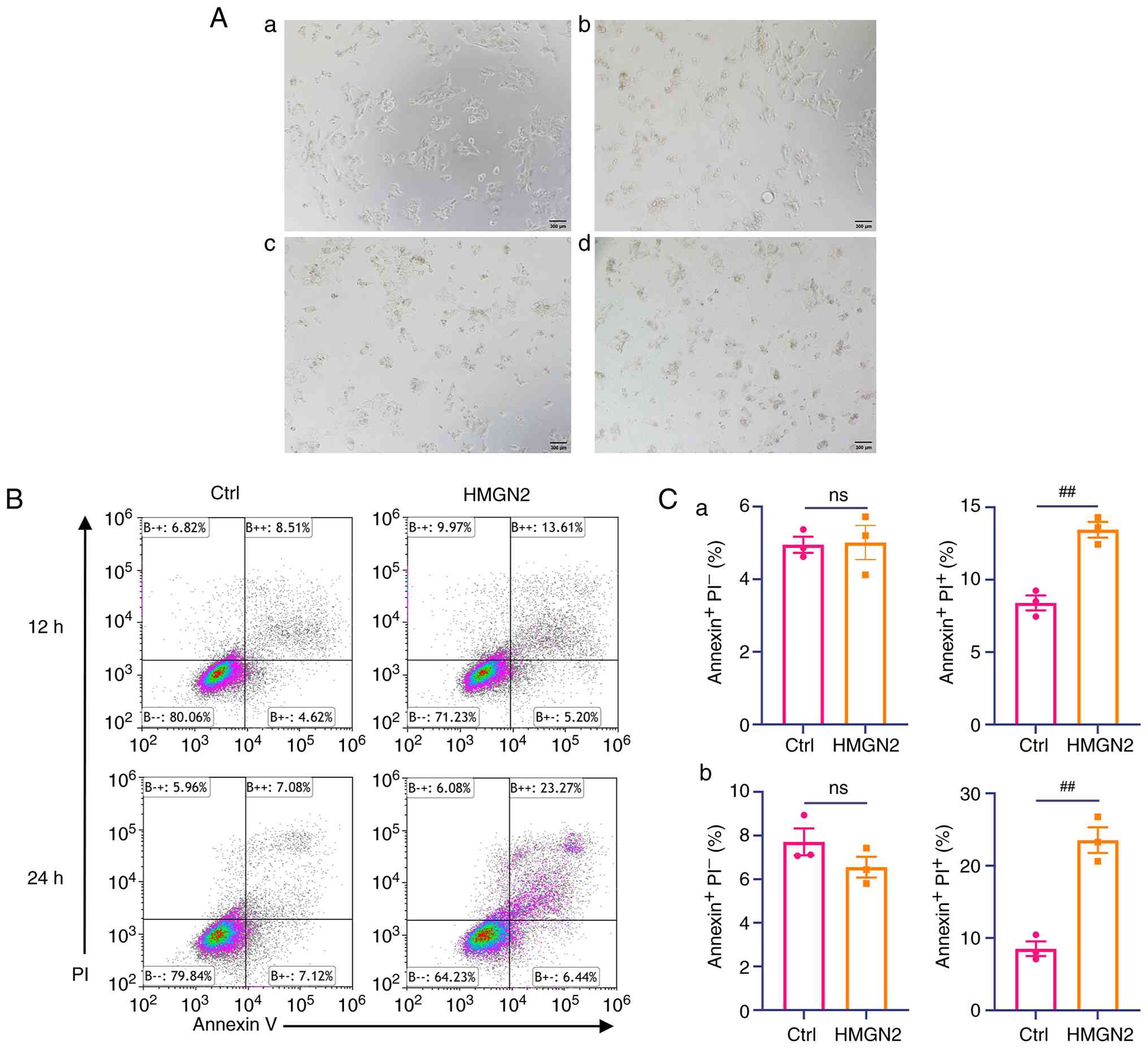 An Annexin V-FITC apoptosis detection kit (cat. no. K2003; APExBIO Technology LLC) was used to detect apoptosis according to the manufacturer's instructions. A total of ~1×105 CAL-27 cells were seeded and cultured in 12-well plates until sub-confluent, after which His-tagged HMGN2 (20 µg/ml) was added for incubation at 37°C for 12 or 24 h. The cells were then washed with 1X PBS and resuspended in 500 µl 1X binding buffer (cat. no. K2003; APExBIO Technology LLC). Subsequently, 5 µl Annexin V-FITC and 5 µl PI were added, and the samples were incubated in the dark at room temperature for 20 min. A CytoFLEX flow cytometer (Beckman Coulter, Inc.) was used for apoptosis analysis. The flow cytometry data were analyzed using Kaluza Analysis software (version 2.4.0; Beckman Coulter, Inc.).