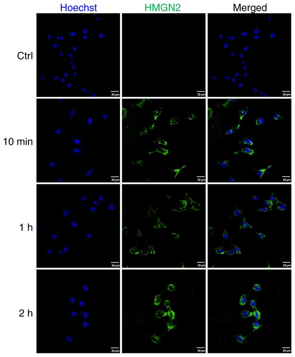 CAL-27 cells were incubated with FITC-labelled HMGN2 for 10 min, 1 and 2 h, and were subsequently detected by confocal laser scanning microscopy. The results revealed that FITC-labelled HMGN2 was localised to the membranes of CAL-27 cells and could be transported into the cells (Fig. 2).
