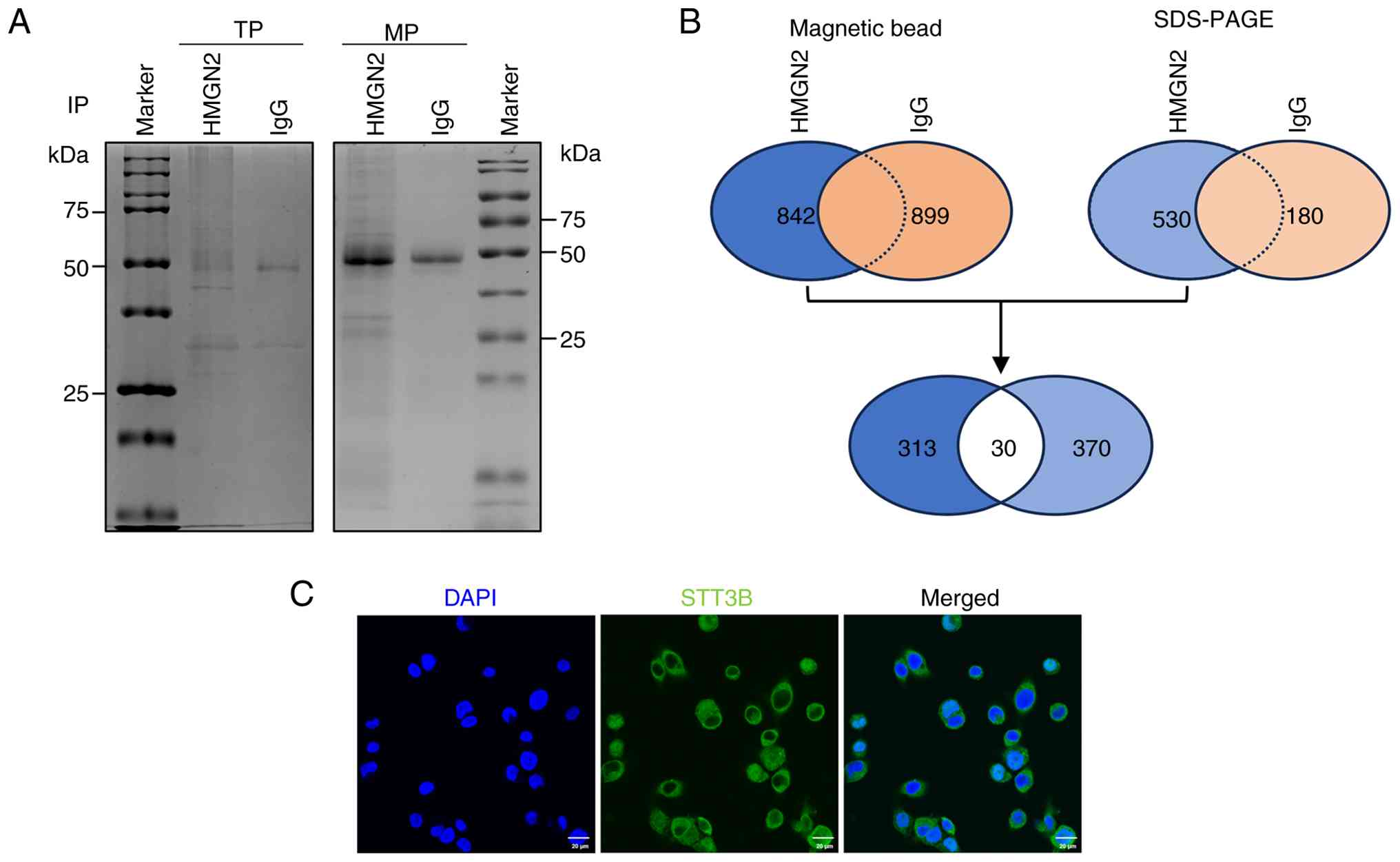 The results of magnetic bead analysis revealed 842 proteins that were immunoprecipitated by the anti-HMGN2 antibody and 530 proteins identified via SDS-PAGE. The results of magnetic bead analysis revealed 899 proteins that were immunoprecipitated by the anti-IgG antibody and 180 proteins identified via SDS-PAGE. However, only 313 proteins were detected after immunoprecipitation with the anti-HMGN2 antibody and not with anti-IgG according to the results of magnetic bead analysis. Similarly, only 370 proteins exclusive to the anti-HMGN2 antibody were detected via SDS-PAGE. The results from magnetic bead and gel analyses were subsequently combined to obtain the 30 top proteins that interact with HMGN2 (Fig. 3B). Only 6 of the 30 proteins screened were located on the membranes of cells, among which STT3B had the highest protein score and propensity score matching (PSM) value (Table I). Immunofluorescence staining supported the subcellular localization of STT3B on cell membranes (Fig. 3C).