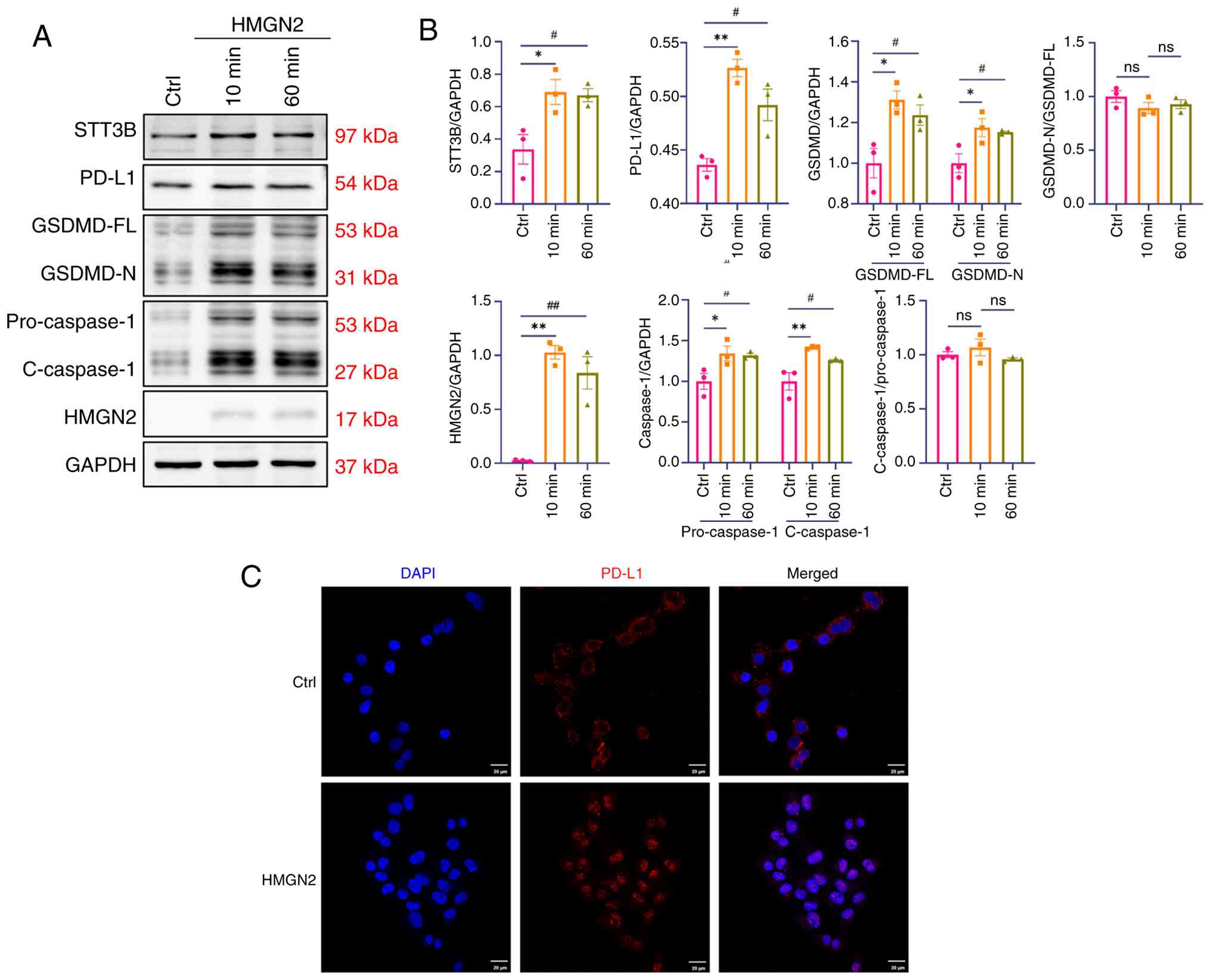 In conclusion, extracellular HMGN2 may induce pyroptosis in tumour cells through the STT3B/PD-L1/caspase-1/GSDMD axis, indicating the capacity of HMGN2 in antitumour immunotherapy, as well as a new mechanism through which CTLs induce antitumour effects.