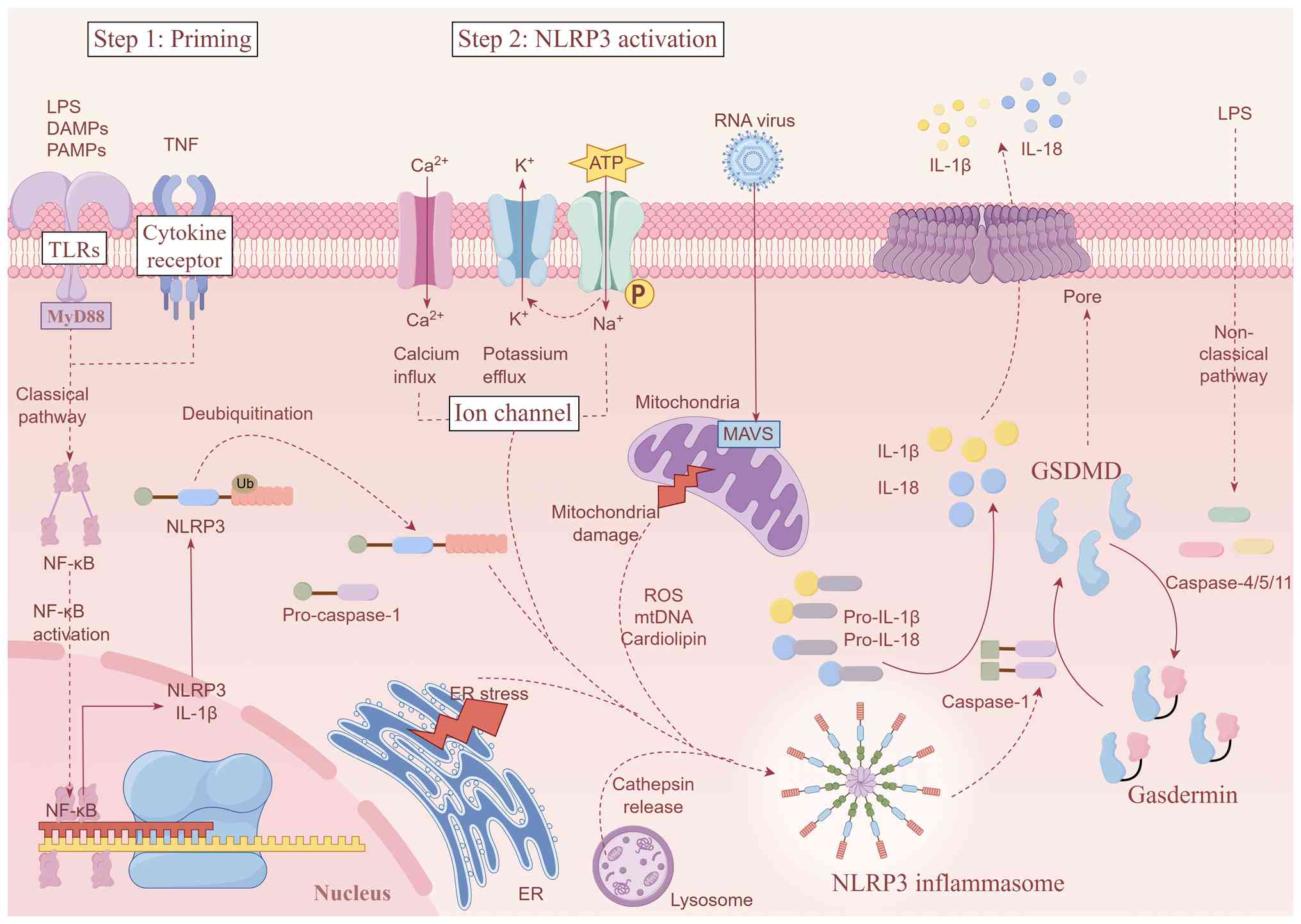 The NLRP3 inflammasome serves as a core regulator of inflammatory pathways, requiring two distinct signals for canonical activation: i) A priming signal: Ligands of Toll-like receptors (TLRs) or cytokine receptors activate the myeloid differentiation primary response gene 88 (MyD88)/nuclear factor κ-light-chain-enhancer of activated B cells (NF-κB) pathway, inducing transcriptional upregulation of NLRP3 and the pro-inflammatory cytokines IL-1β and IL-18 (26); and ii) an activation signal: Diverse PAMPs, such as bacterial flagellin, lipopolysaccharide (LPS) and viral RNA, or DAMPs trigger oligomerization of ASC and pro-caspase-1, culminating in NLRP3 inflammasome complex assembly (35).