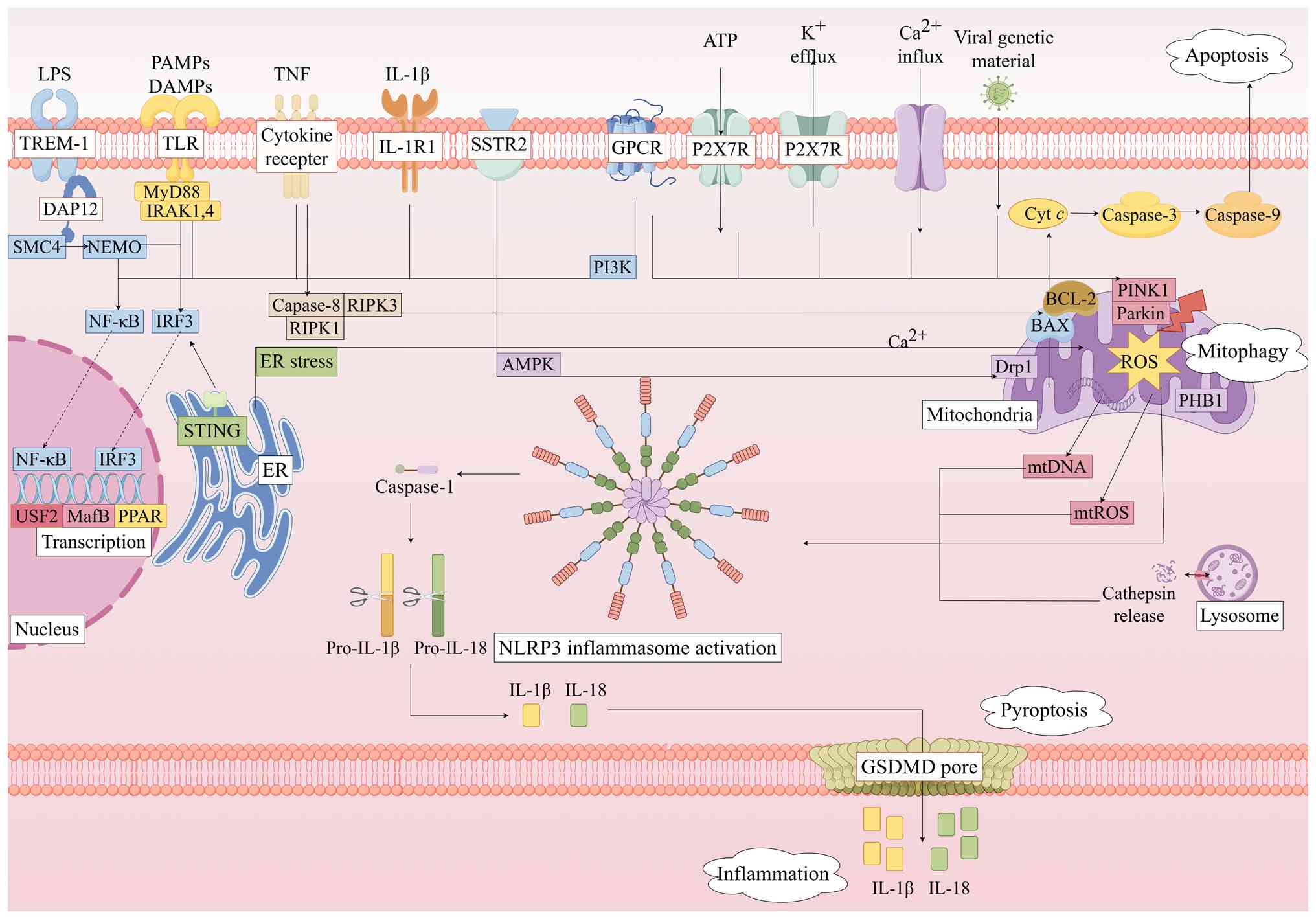 Upon oligomerization and activation, the NLRP3 inflammasome recruits ASC via PYD-PYD interactions. The resulting complex facilitates pro-caspase-1 autocleavage, generating active caspase-1 that processes pro-IL-1β and pro-IL-18 into mature cytokines (42). Concurrently, activated caspase-1 cleaves gasdermin D (GSDMD), liberating the GSDMD N-terminal (GSDMD-NT) domain that subsequently translocates to the plasma membrane, forming pores that mediate the release of inflammatory mediators, including IL-1β and IL-18, and drive pyroptosis, a mode of lytic inflammatory cell death (43). In SIC, pyroptosis releases DAMPs, such as IL-1β, IL-18 and mtDNA, amplifying inflammation and NLRP3 activation through positive feedback. Notably, the inflammatory milieu and DAMPs (e.g., mtDNA) released during pyroptosis can also modulate other cell death and clearance pathways, including apoptosis and mitophagy (44). This cascade ultimately induces myocardial dysfunction and structural damage, representing a core pathogenic mechanism in SIC (45). Pharmacologically, fatty acid amide hydrolase (FAAH) inhibitors disrupt NLRP3-FAAH interactions, promoting NLRP3 degradation (46). This evidence indicates that targeting NLRP3 attenuates inflammatory responses by modulating interconnected pathways involving inflammation, pyroptosis, apoptosis and mitophagy. Nevertheless, the precise molecular targets governing these pathways require further elucidation (Fig. 2).