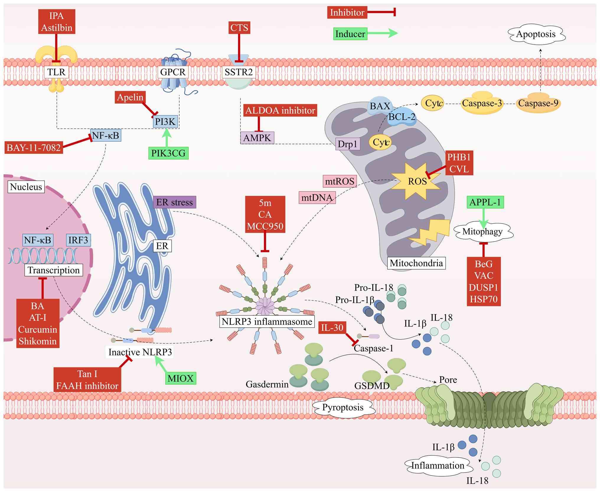 Multiple pathways converge on NLRP3 to regulate pyroptosis: TLR4 activation initiates NLRP3 priming via the MyD88/NF-κB pathway, while pharmacological inhibition of NF-κB suppresses the resulting caspase-1 expression and pyroptosis (62,82). Protective factors such as heat shock protein 70 (83), apelin via adenosine 5′-monophosphate-activated protein kinase (AMPK) signaling (84) and cortistatin via somatostatin receptor 2 (SSTR2)/AMPK signaling (85) inhibit NLRP3 activation and downregulate pyroptosis-executing proteins such as GSDMD and caspase-1. Conversely, phosphatidylinositol-4,5-bisphosphate 3-kinase catalytic subunit γ promotes NLRP3 assembly via G protein-coupled receptor (GPCR)-induced NF-κB activation, exacerbating pyroptosis (86,87).