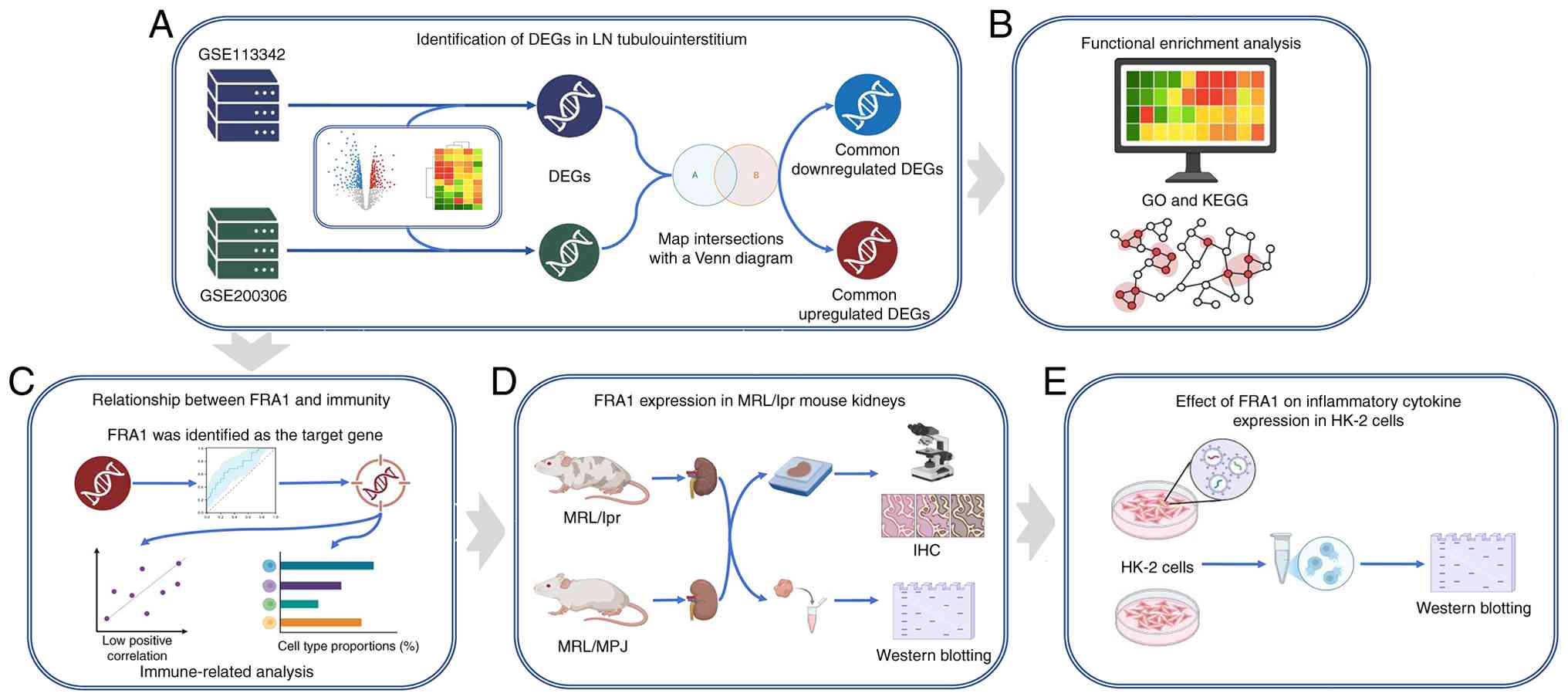 Based on these observations, bioinformatic analysis of public gene expression datasets was performed to identify FRA1 as a potential key candidate in LN. The present study aimed to investigate the role of FRA1 in the pathogenesis of LN and to elucidate its underlying molecular mechanisms. The bioinformatics analyses were combined with validation in the MRL/lpr mouse model and in vitro experiments using HK-2 cells to systematically characterize FRA1 expression patterns and its regulatory effects on the inflammatory cytokine network in LN. By constructing FRA1 overexpression and knockdown cell models, the impact of FRA1 on tubular epithelial cell function and inflammatory responses, was further examined aiming to provide new insights into LN pathogenesis and to identify potential therapeutic targets.