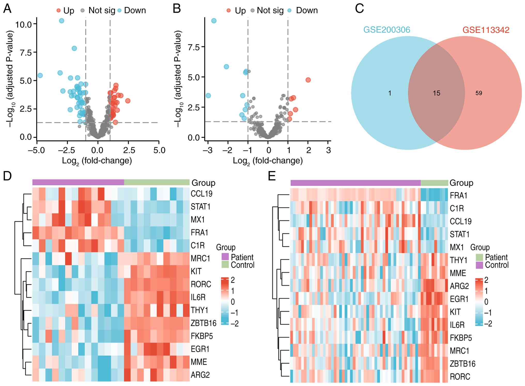Design of the present study is illustrated in Fig. 1. To determine gene expression differences between LN and healthy controls tubulointerstitial samples, the datasets GSE113342 and GSE200306 from GEO were analyzed. Using |log2FC|>1 and adjusted P<0.05, 74 DEGs were identified in GSE113342 (Fig. 2A) and 16 DEGs were identified in GSE200306 (Fig. 2B). The intersection of these yielded 15 common DEGs (Fig. 2C), of which FRA1, C1R, CCL19, STAT1 and MX1 were upregulated in LN, whereas THY1, MME, ARG2, EGR1, KIT, IL6R, FKBP5, MRC1, ZBTB1 and RORC were downregulated. A heatmap illustrates their expression patterns across both datasets (Fig. 2D and E).