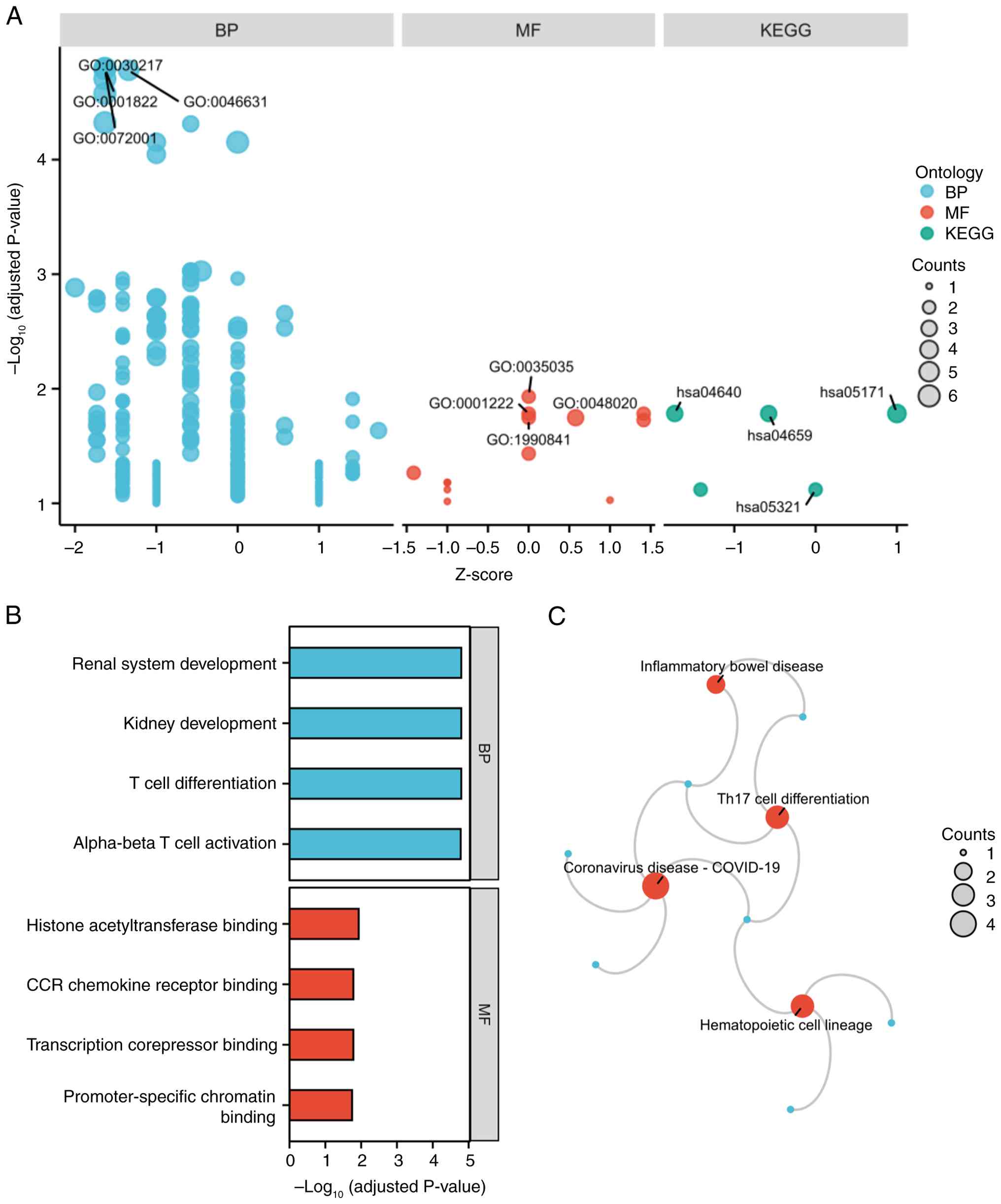 GO and KEGG enrichment analyses of the 15 shared DEGs revealed significant associations with immune and developmental processes (Fig. 3A). In GO-BP, DEGs were enriched in ‘T cell differentiation’, ‘kidney development’, ‘renal system development’ and ‘alpha-beta T cell activation’ (Fig. 3B). In GO-MF, terms included ‘histone acetyltransferase binding’, ‘transcription corepressor binding’, ‘CCR chemokine receptor binding’, ‘promoter-specific chromatin binding’ (Fig. 3B). KEGG pathways highlighted ‘Coronavirus disease-COVID-19’, ‘Hematopoietic cell lineage’, ‘Th17 cell differentiation’ and ‘Inflammatory bowel disease’ as pathways significantly associated with the DEGs (Fig. 3C).