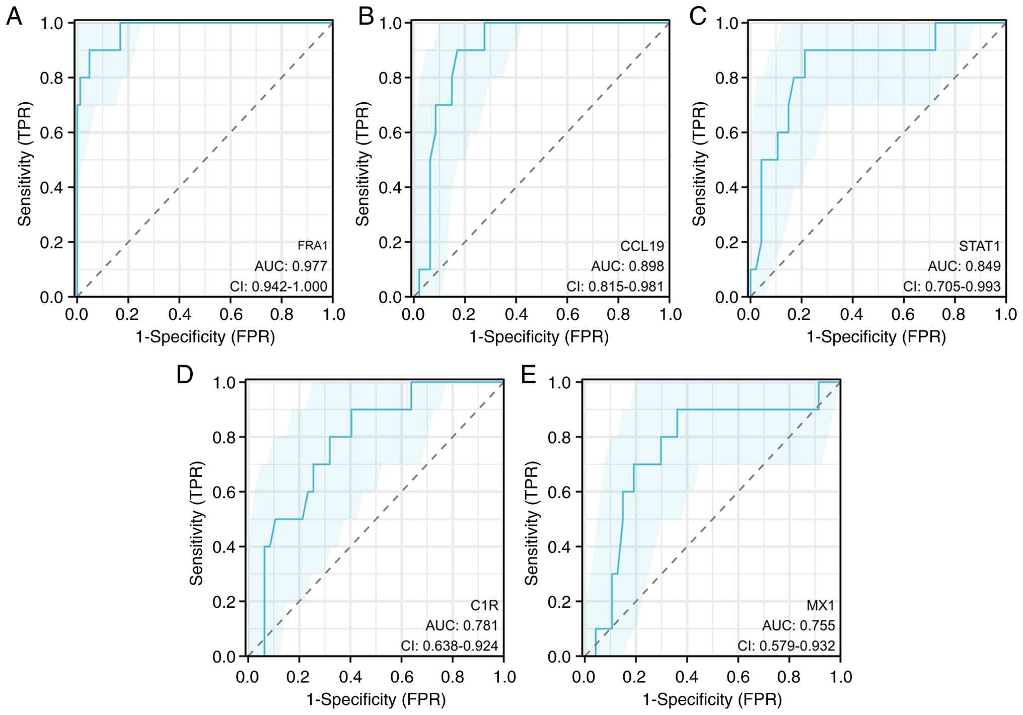 To prioritize candidates for functional follow-up, the diagnostic performance of five upregulated DEGs was assessed, and FRA1 was identified as the top performer (AUC=0.977; Fig. 4); therefore, downstream analyses focused on FRA1. In addition, further analysis of the datasets showed that the trend of FRA1 remained stable across different subgroups and after exclusion of outliers, indicating that the upregulation of FRA1 in LN is robust and minimally affected by dataset heterogeneity (Fig. S2). Next, the relationship between FRA1 expression and immune cell infiltration in LN tubulointerstitial samples was explored using CIBERSORT on dataset GSE127797.