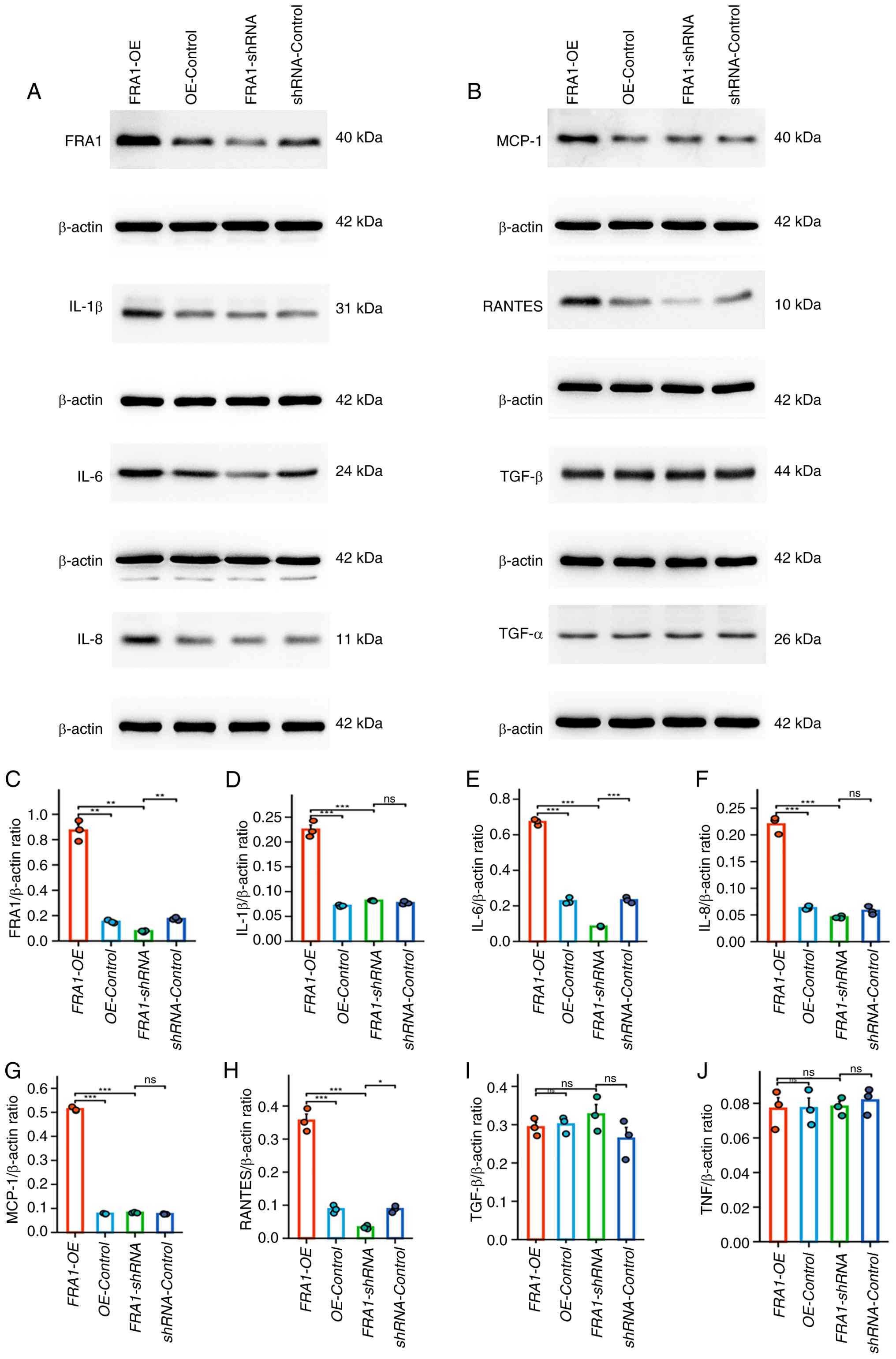 To investigate the functional role of FRA1 in renal tubular epithelial cells, the expression of key cytokines were measured in HK-2 cells following lentivirus-mediated FRA1 overexpression (FRA1-OE) or knockdown (FRA1-shRNA). Western blot analysis at 144 h post-infection showed that IL-6, IL-1β, IL-8, MCP-1 and RANTES were significantly upregulated in the FRA1-OE group, whereas IL-6 and RANTES levels were decreased in the FRA1-shRNA group (Fig. 7). TNF-α and TGF-β expression remained unchanged in both FRA1-OE and FRA1-shRNA cells. These results demonstrate that FRA1 modulates multiple proinflammatory cytokines in human renal tubular epithelial cells, suggesting its potential role as a regulator of the tubulointerstitial immune microenvironment in LN.