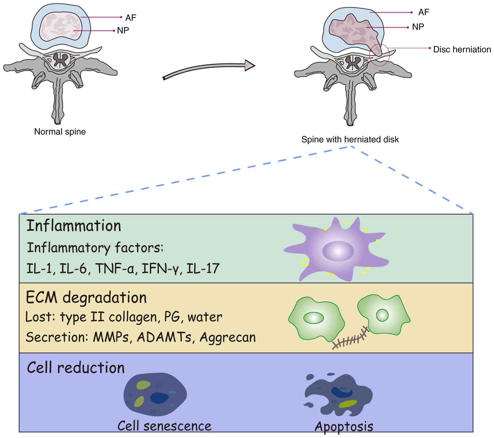 IVDD is influenced by multiple risk factors, including smoking, alcohol consumption, occupational standing height, socioeconomic status, sleep disturbances, hypertension, type II diabetes and obesity. Of note, metabolic dysregulation appears to have a more profound impact on IVDD progression than biomechanical stress (18). The pathological process of IVDD is characterized by extracellular matrix dysregulation, leading to progressive proteoglycan loss and dehydration of the NP (19). In addition, excessive mechanical loading and aging impair cartilage endplate function, further exacerbating disc degeneration (20). Apoptosis and autophagy of nucleus pulposus cells (NPCs) contribute markedly to IVDD pathophysiology, whereas hypoxia and an acidic microenvironment deplete essential nutrients, ultimately resulting in AF fissures and NP herniation (21). Inflammatory cytokines, including tumor necrosis factor-α (TNF-α) and interleukins-1α/β (IL-1α/β), IL-6 and IL-17, play a critical role in promoting disc degeneration by inducing metabolic imbalances within the IVD (2).