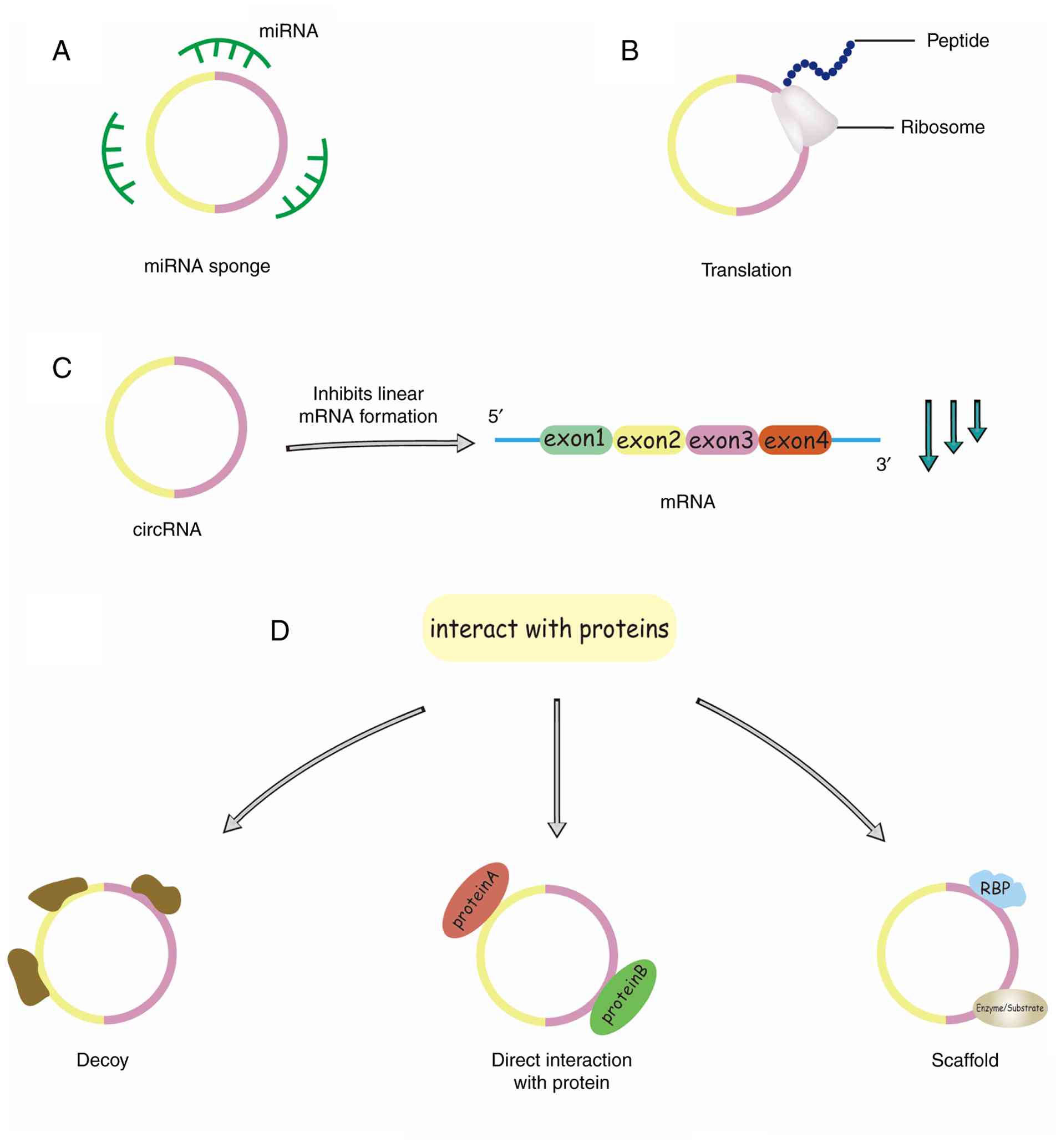 CircRNAs, as a subset of ncRNAs, are formed through the back-splicing of pre-mRNA (32). This results in a closed-loop structure that lacks 3′ and 5′ termini, rendering circRNA resistant to exonuclease degradation and conferring remarkable stability (33); however, circRNAs are generally synthesized at the expense of their linear equivalents (Fig. 2C) (34). CircRNA has been reported to be involved in physiological and pathological processes in a variety of ways. circRNAs can act as miRNA sponges (Fig. 2A) or decoys to enhance the activity of target RNA translation. Furthermore, circRNAs can interact with RNA-binding proteins (RBPs) through distinct mechanisms: they can act as protein ‘sponges’ to sequester RBPs and indirectly regulate their function, or they can bind to specific proteins directly to enhance their activity. Some circRNAs serve as molecular scaffolds, facilitating interactions between enzymes and substrates to modulate reaction kinetics (Fig. 2D). Furthermore, circRNAs can recruit specific proteins to distinct cellular compartments, thereby influencing various physiological and pathological processes (35). Emerging evidence reveals that circRNAs exhibit protein-coding potential, even though protein-coding genes constitute <2% of the entire genome (Fig. 2B) (36).