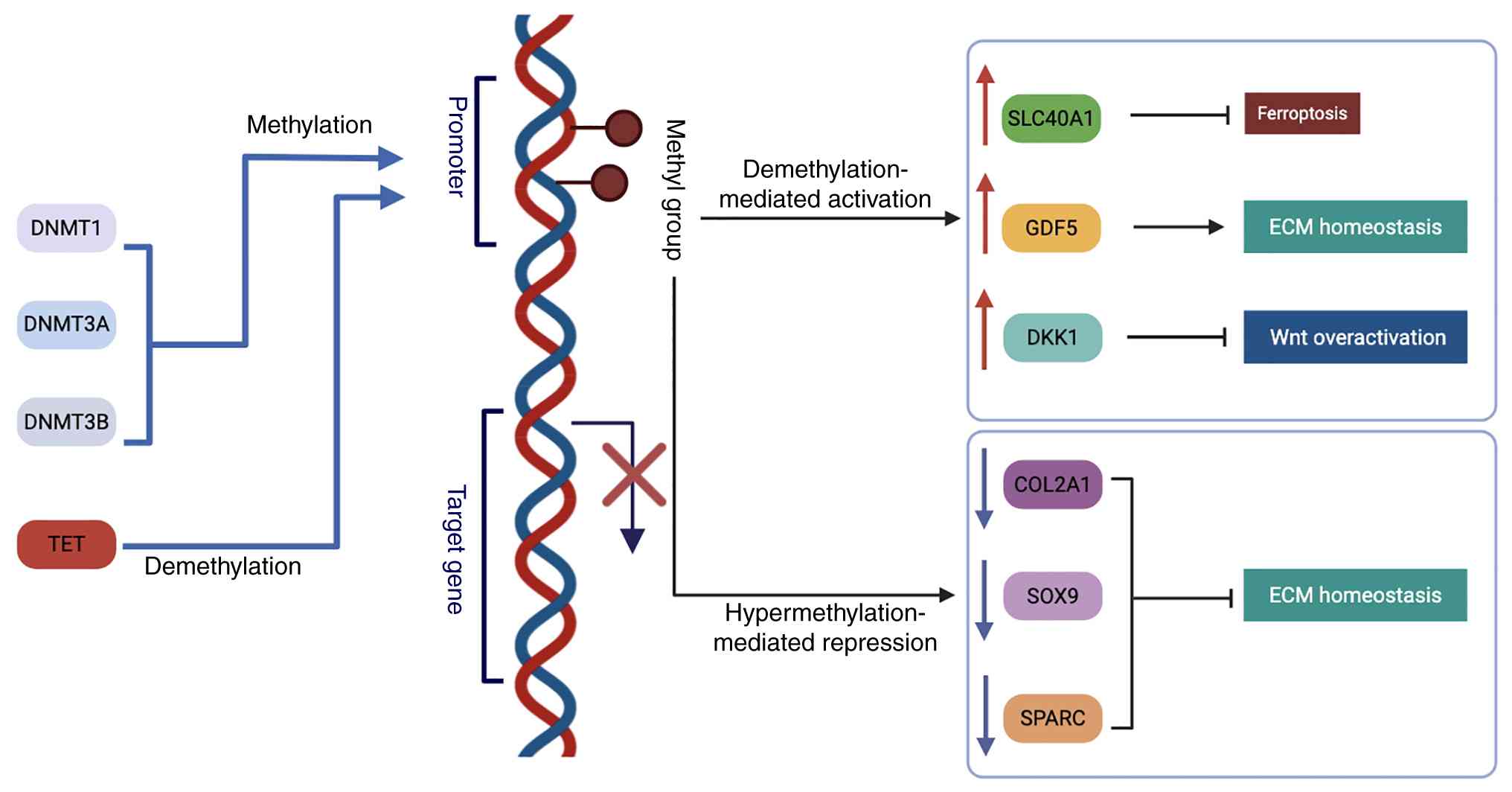 DNA methylation not only affects gene transcription but also interacts with other epigenetic processes, such as histone modifications, ncRNA-mediated regulation and RNA methylation, to amplify injury from senescence, inflammation and oxidative stress (6). Inflammatory signals can stimulate DNMT and ten-eleven translocation (TET) enzyme expression, while oxidative stress can modulate the activity of methyltransferases via the p38/MAPK pathway, increasing catabolic enzyme expression (19).