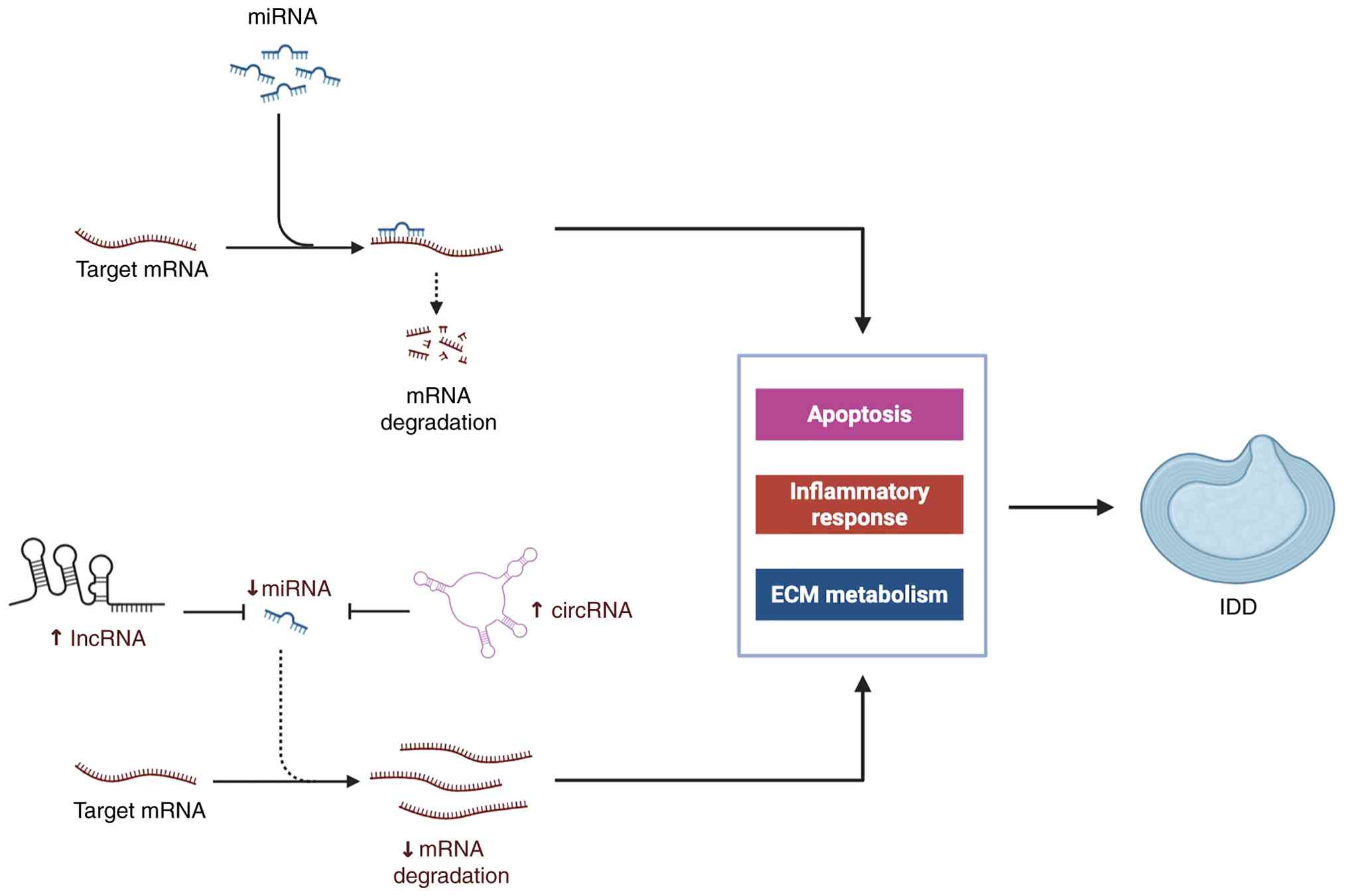 ncRNAs have attracted attention in the study of IDD. ncRNAs, including miRNAs, long non-coding RNAs (lncRNAs) and circular RNAs (circRNAs), regulate various cellular processes related to IDD, including ECM metabolism, inflammation, oxidative stress, apoptosis and ferroptosis (35).