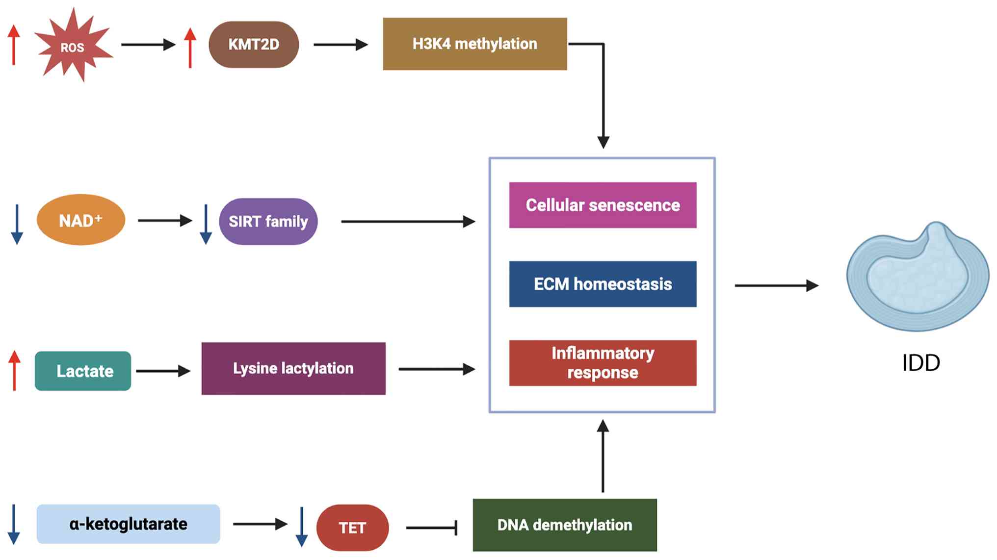 Excessive reactive oxygen species (ROS) can activate p38/MAPK, ERK and other signaling pathways, thereby affecting the stability and transcriptional activity of histone methyltransferases (such as KMT2D) and other epigenetic factors (for example, DNMTs and HDACs). This leads to the upregulation of matrix-degrading genes (MMPs and ADAMTS) and exacerbates ECM degradation (19). Notably, oxidative stress is not only a product of metabolic imbalance but also amplifies degeneration via DNA and histone modifications (19).