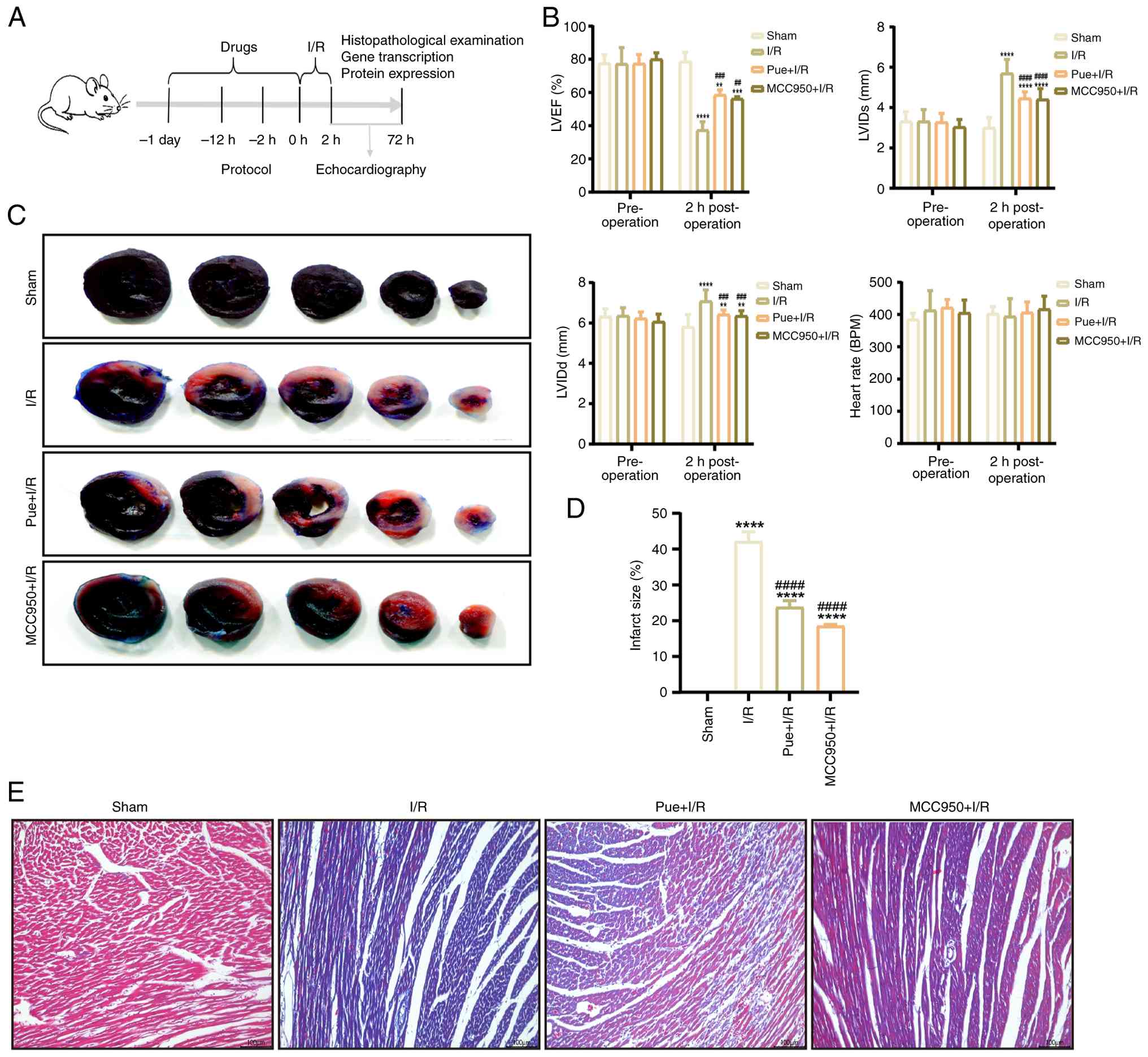 To evaluate the protective effects of Pue preconditioning on MIRI, the present study established a rat model of MIRI (Fig. 1A). There were no significant differences in cardiac function parameters observed among the four experimental groups during pre-operative echocardiography. The I/R group showed significantly increases in left ventricular internal diastolic diameter and left ventricular internal diameter at systole along with significantly decreased LVEF values compared with the sham group post-operation. Therefore, Pue administration improved cardiac function in I/R model rats (Fig. 1B). TTC staining revealed that all three experimental groups showed higher myocardial infarction areas, represented by lighter reddish areas, than the sham group, with the most obvious infarction observed in the I/R group. Compared with the I/R group, both Pue and MCC950 treatments significantly reduced infarction area, suggesting that Pue intervention alleviated myocardial infarction (Fig. 1C and D).