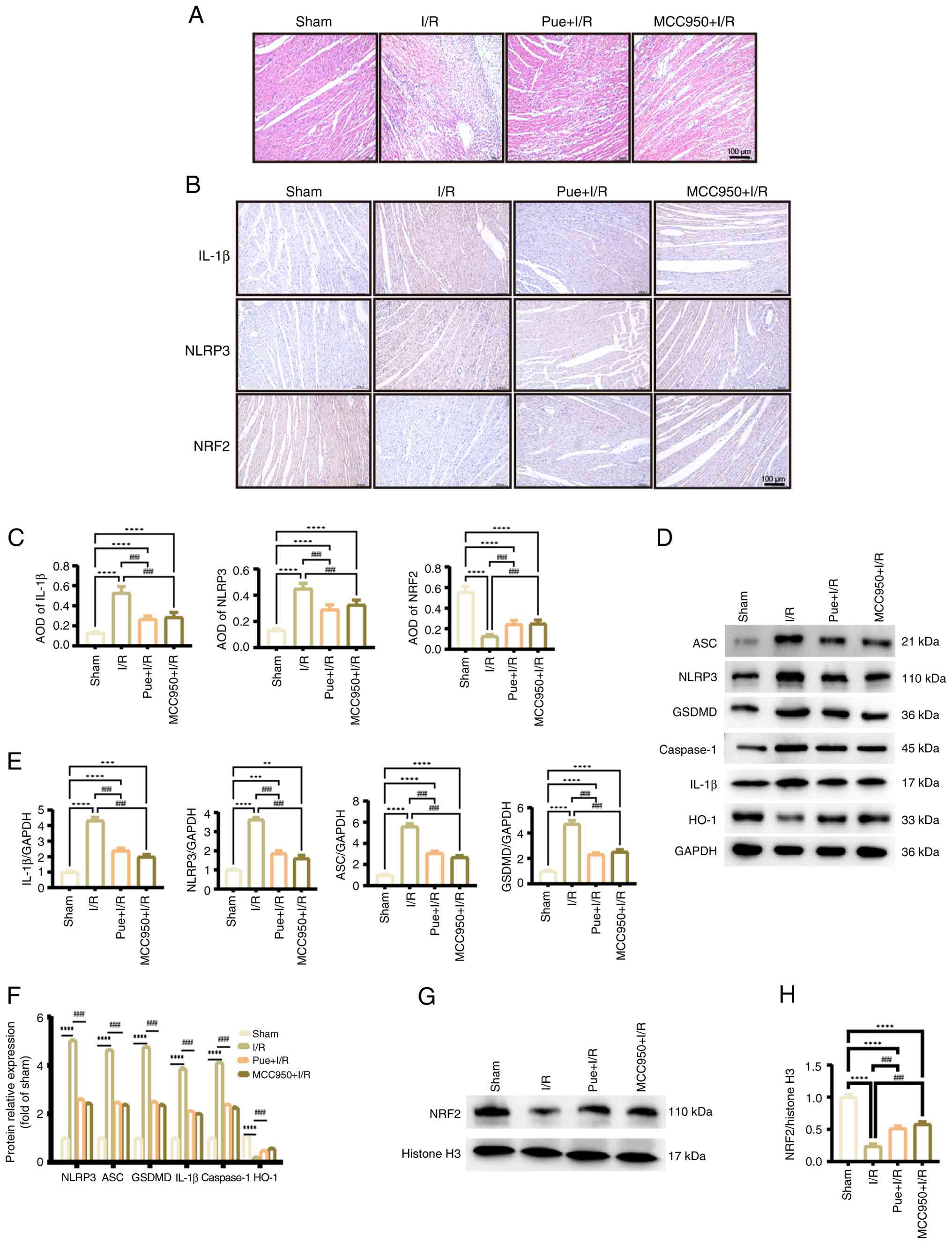 Following myocardial I/R, cardiomyocytes undergo various forms of cell death, leading to the expansion of the damaged area and the exacerbation of ischemic injury. Recent studies have demonstrated that pyroptosis is associated with myocardial I/R and depends on inflammatory mediators (4,17,18). As a result, the anti-pyroptotic effects of Pue can be observed by detecting the release of inflammatory factors. H&E staining showed notable inflammatory cell infiltration, nuclear displacement and cardiomyocyte necrosis in the I/R group compared with the sham group, which were markedly reduced in the Pue treatment group (Fig. 2A). IHC was used to assess inflammasome protein expression and localization in myocardial tissue. Compared with the sham group, the expression of NLRP3 and IL-1β in the I/R group were significantly increased, whereas these expression significantly decreased after treatments with Pue and MCC950. Since the NRF2/HO-1 pathway serves an important role in regulating the antioxidant responses of cell, IHC also demonstrated a significant increase in the expression of NRF2 in the Pue and MCC950 groups compared with the I/R group (Fig. 2B and C).
