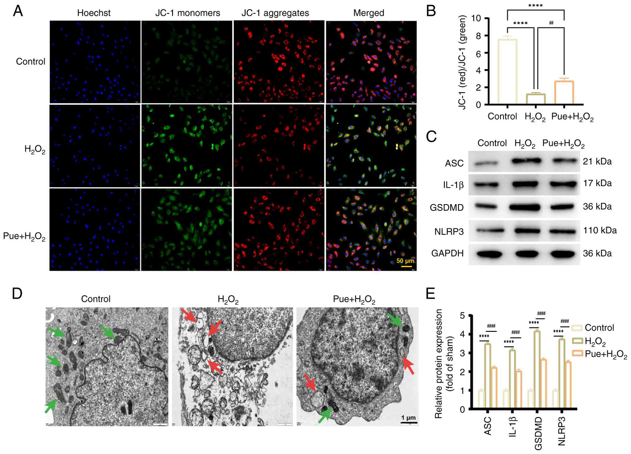 JC-1 staining was used to assess the mitochondrial membrane potential of rat cardiomyocytes. Red fluorescence indicated a high mitochondrial membrane potential, while green fluorescence represented the low mitochondrial membrane potential of cardiomyocytes. Compared with controls, cells in the H2O2 group exhibited significantly reduced red fluorescence and increased green fluorescence, suggesting a notable decrease in mitochondrial membrane potential. Pue pretreatment was shown to significantly increase the red/green fluorescence ratio compared with the H2O2 group (Fig. 3A and B). The ultrastructural changes in cells were observed by TEM. In the control group, the morphology and size of mitochondria were normal and mitochondrial cristae were continuous, complete and clearly visible. By contrast, in the H2O2 group, mitochondria became swollen, with notable loss of cristae, severe vacuolization and nuclear alterations observed, indicating a tendency towards pyroptosis. However, Pue treatment mitigated mitochondrial swelling, disruption of cristae and membrane rupture while restoring nuclear integrity (Fig. 3D). To determine whether the pyroptosis pathway was activated, the expression of key proteins was detected via western blotting. Compared with the control group, the expression levels of NLRP3, ASC, GSDMD and IL-1β were significantly increased in the H2O2 group. However, the expression of the aforementioned proteins was shown to decrease after Pue treatment. These results indicated that Pue protected H9C2 cells from pyroptosis (Fig. 3C and E).