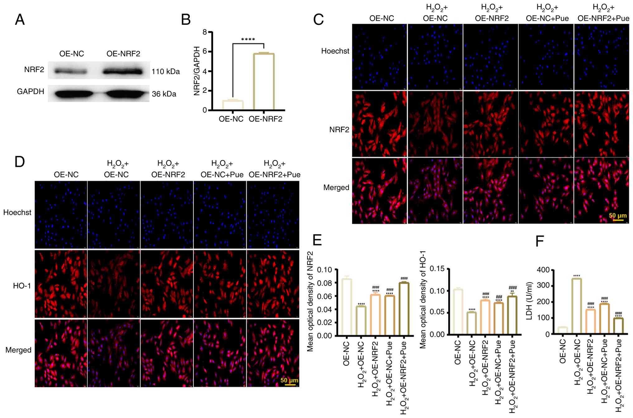 To clarify the possible mechanism by which Pue inhibited cardiomyocyte pyroptosis, the present study constructed an NRF2 overexpression plasmid and verified its expression after transfection via western blotting. The expression of NRF2 in the overexpression plasmid group was significantly higher compared with that in the control plasmid group, indicating a successful construction of the NRF2 overexpression plasmid (Fig. 4A and B). To observe the regulatory effect of Pue on the NRF2/HO-1 signaling pathway, cardiomyocytes were treated with Pue and reclassified into five groups. Immunofluorescence results showed that NRF2 and HO-1 expression levels decreased significantly in control group cells after H2O2 treatment. However, compared with the H2O2 + OE-NC group, NRF2 was significantly activated in the H2O2 + OE-NRF2, H2O2 + OE-NC + Pue and H2O2 + OE-NRF2 + Pue group. Furthermore, the significantly increased expression of HO-1 in the aforementioned groups suggested that Pue enhanced the nuclear translocation of NRF2 (Fig. 4C-E). During myocardial infarction, the integrity of the cell membrane is damaged, resulting in the release of LDH into the supernatant, which may act as an indirect indication of pyroptosis (19). Based on the results of the LDH release test, the concentration of LDH increased significantly after H2O2 treatment compared with the OE-NC group. Compared with the H2O2 + OE-NC group, overexpression of NRF2 or Pue treatment, both individually and in combination, significantly decreased the release of LDH that was influenced by H2O2 treatment, suggesting that Pue activated NRF2 to exert protective effects on cardiomyocytes (Fig. 4F).