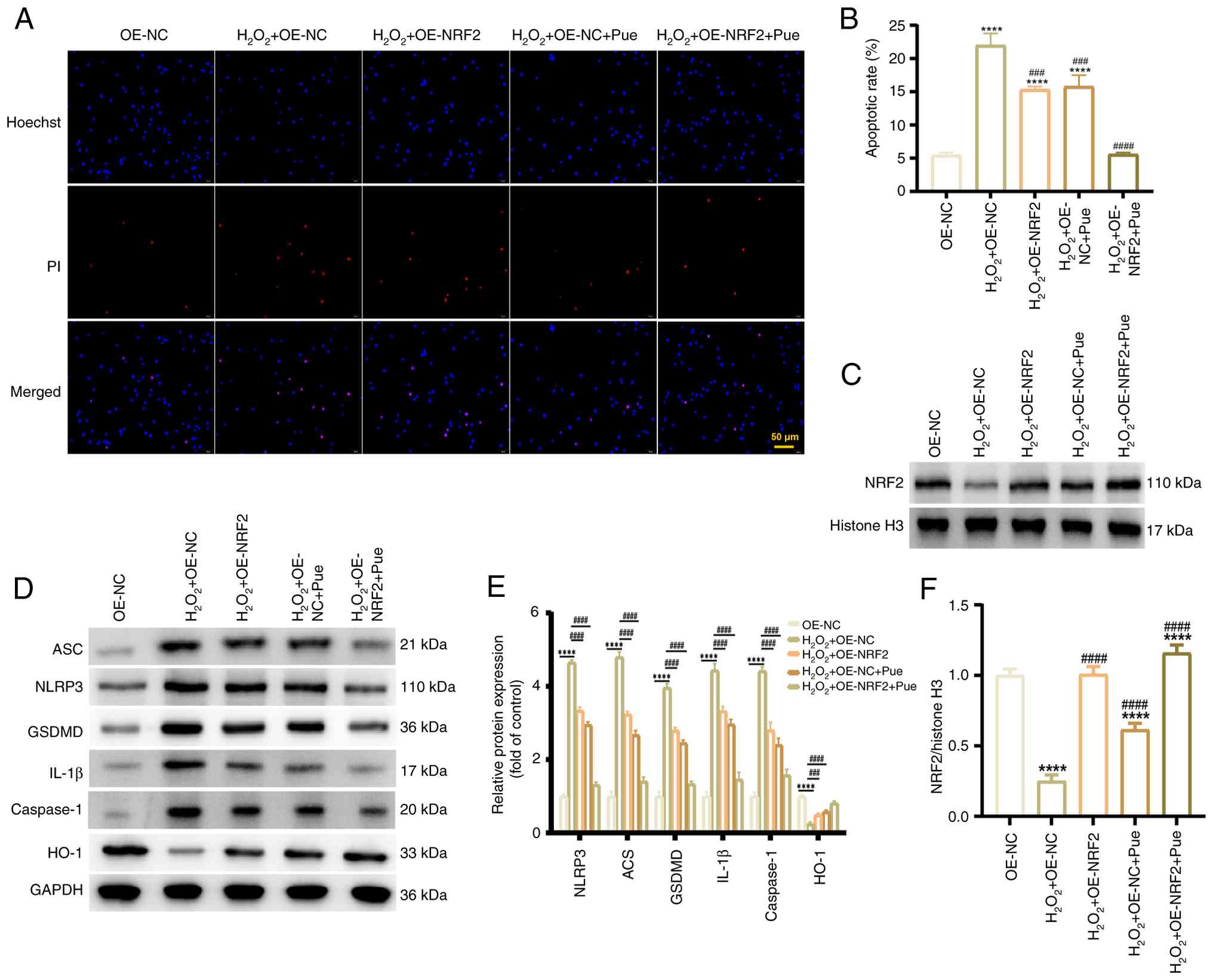 Pue inhibits H2O2-induced cardiomyocyte pyroptosis through the NRF2/HO-1 pathway. To further clarify whether Pue affected pyroptosis via the NRF2/HO-1 pathway, Hoechst 33342/PI staining was used to detect pyroptotic cells. Compared with the OE-NC group, the red fluorescence of cells in the H2O2 + OE-NC group was significantly enhanced, indicating an increased degree of pyroptosis. However, the red fluorescence of cardiomyocytes significantly decreased after an overexpression of NRF2 or treatment with Pue, suggesting a notable reduction in the proportion of pyroptotic cells following these treatments compared with the H2O2 + OE-NC group (Fig. 5A and B). Western blot analysis demonstrated that the protein expression of pyroptosis-related proteins NLRP3, ASC, GSDMD, caspase-1 and IL-1β was lower in the H2O2 + OE-NC + Pue and H2O2 + OE-NRF2 + Pue groups compared with that in the H2O2 + OE-NC group. Meanwhile, the protein levels of NRF2 and HO-1 were higher in the aforementioned groups compared with the H2O2 + OE-NC group (Fig. 5C-F). Under conditions of oxidative stress, Pue appears to have increased NRF2 expression and decreased cardiomyocyte pyroptosis. Thus, Pue was shown to activate the NRF2/HO-1 signaling pathway, thereby inhibiting NLRP3/caspase-1/GSDMD pathway-mediated pyroptosis and protecting cardiomyocytes from injury during MIRI (Fig. 6).