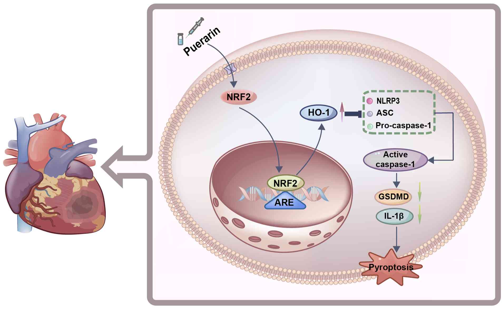 Pue, as the main active component of the traditional Chinese medicine Pueraria lobata, has been demonstrated to display multiple protective effects on the cardiovascular system (7). The present study aimed to verify the anti-pyroptotic effect of Pue, exploring its influence on the molecular mechanisms involved in MIRI. Primarily, the present study observed that Pue exhibited a cardioprotective effect on MIRI. Pretreatment with Pue effectively mitigated MIRI-induced myocardial injury, improved cardiac function and partially decreased myocardial fibrosis Additionally, MIRI has been shown to result in elevated oxidative stress and an inflammatory response, accompanied by pyroptosis of cardiomyocytes (20). In the present study, both in vivo and in vitro experiments demonstrated that Pue reduced the expression of pyroptosis-related proteins and relieved cardiomyocyte pyroptosis, ultimately improving the inflammatory microenvironment. Furthermore, NRF2 activation exhibited cardioprotective effects by regulating HO-1, which is its downstream antioxidant enzyme. The overexpression of NRF2 significantly enhanced the inhibitory effect of Pue on pyroptosis, further validating the importance of this pathway. Therefore, the present study provided a novel theoretical basis for the protective mechanism of Pue during MIRI.