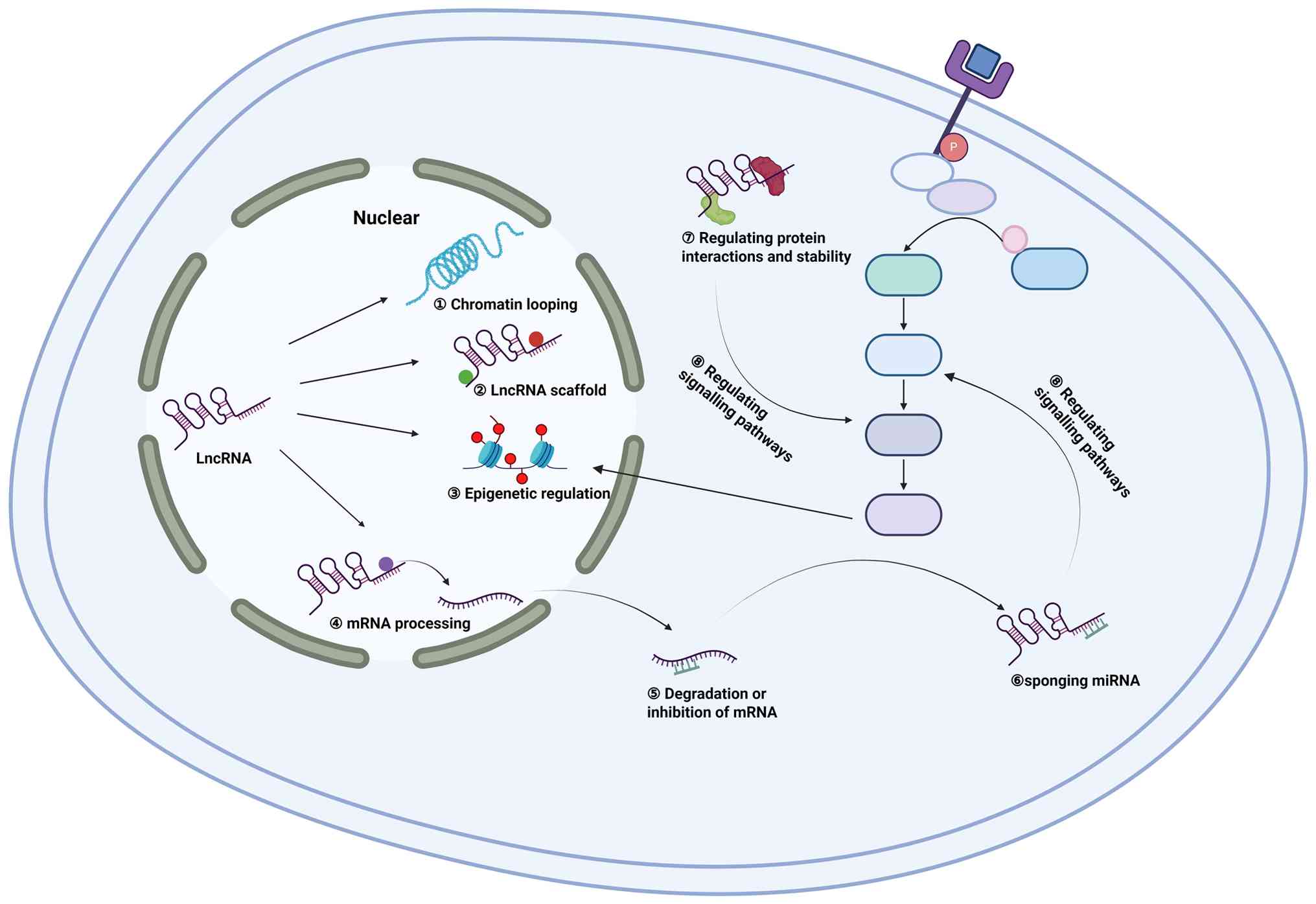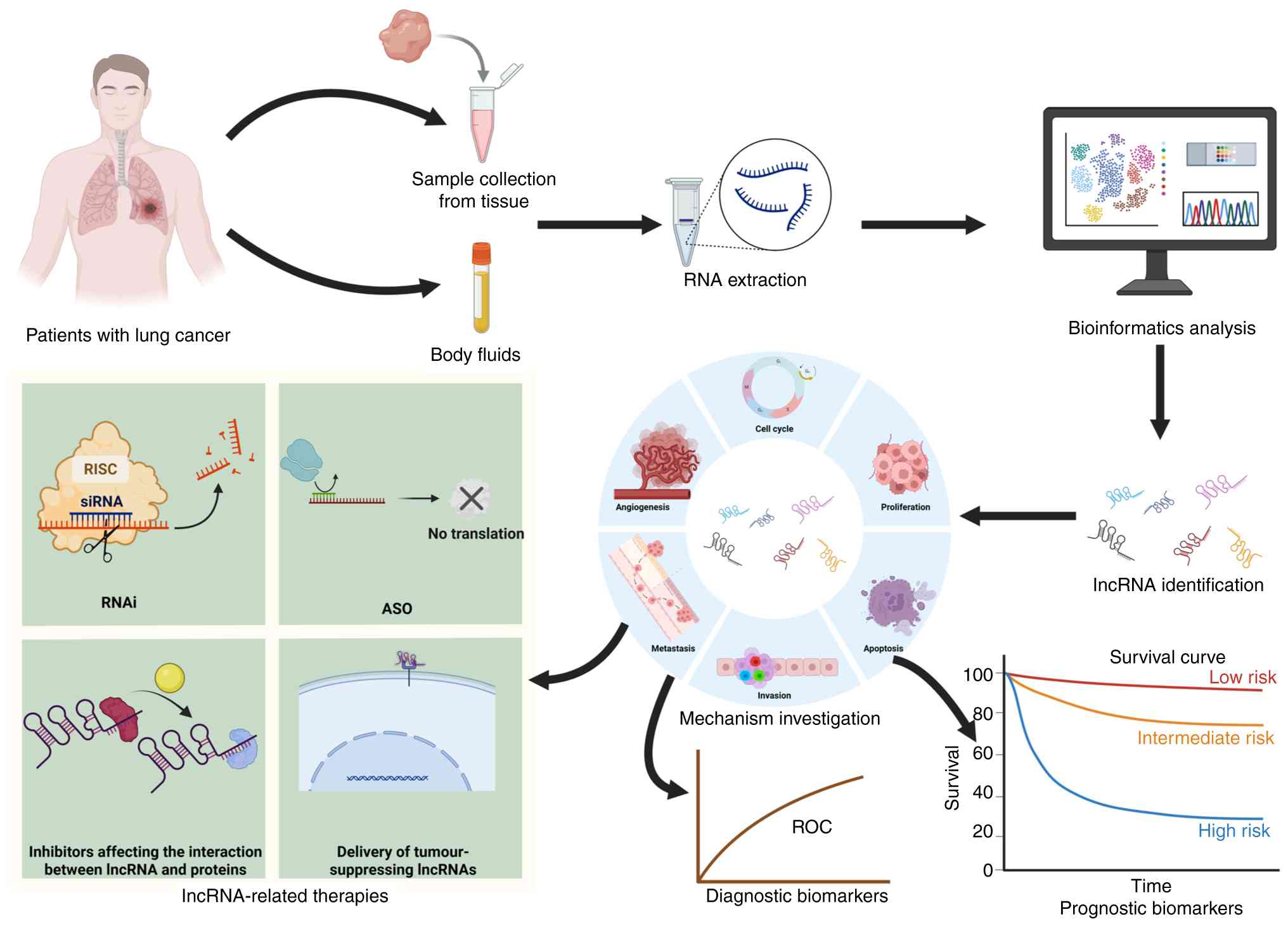 Lung cancer is the most common type of cancer in the respiratory system. The pathogenesis of lung cancer is highly complex and remains incompletely understood. Understanding the mechanisms underlying lung cancer is crucial for developing effective therapeutic strategies. Accumulating evidence indicates that numerous dysregulated lncRNAs contribute to lung cancer development and progression. These molecules are implicated in a range of biological processes, including proliferation, apoptosis, invasion, metastasis and angiogenesis. Moreover, aberrant lncRNA expression can be readily detected in the body fluids of patients and shows strong correlations with TNM stage, highlighting their potential as non-invasive biomarkers and therapeutic targets (Fig. 3).