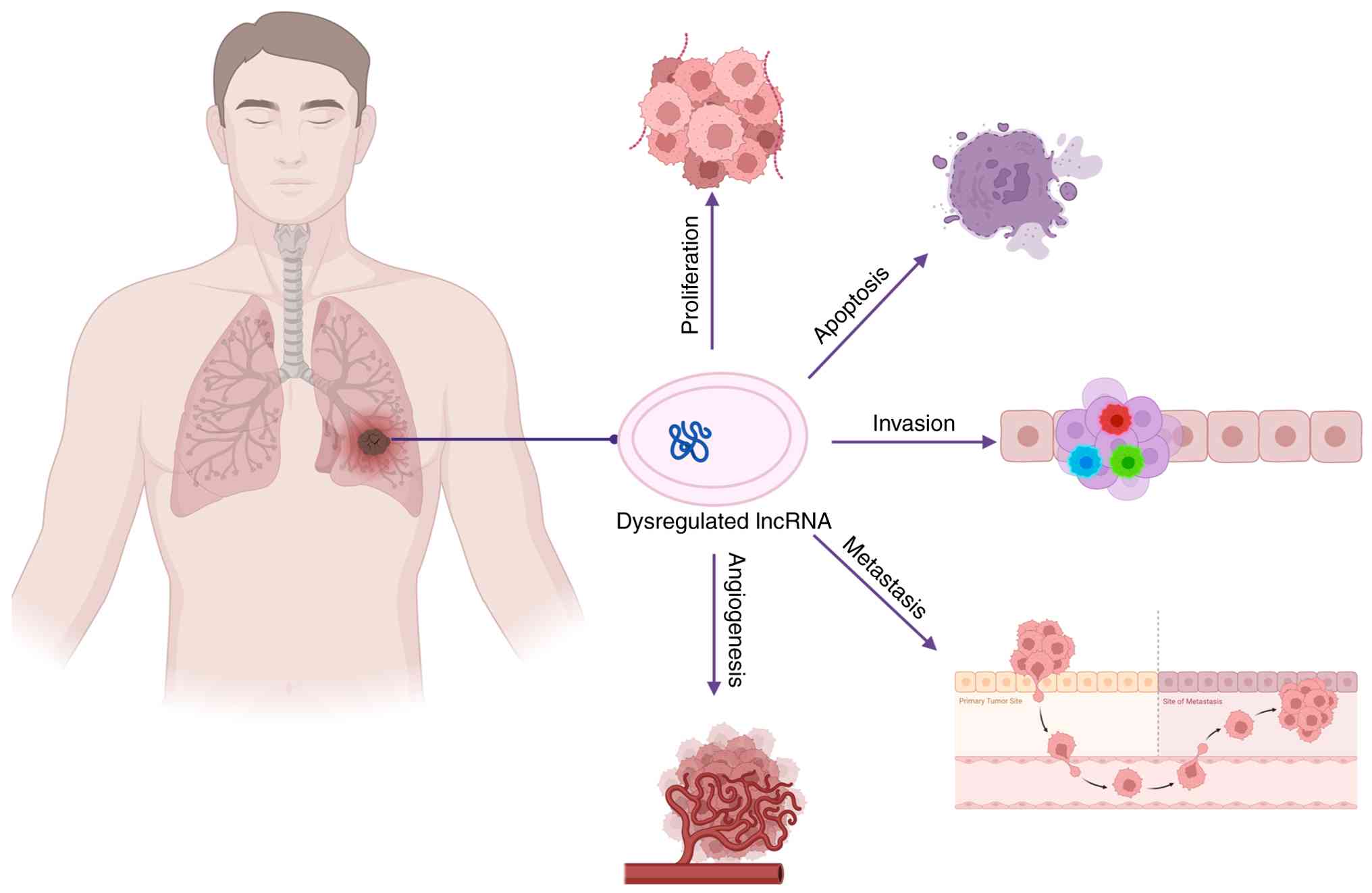 The onset and progression of lung cancer are both driven by dysregulated gene expression, typically involving the activation of oncogenes and the inhibition of tumor suppressor genes. lncRNAs have been identified as key regulatory factors that influence lung cancer cell proliferation and apoptosis, as well as invasion, metastasis and tumor angiogenesis (Fig. 2).