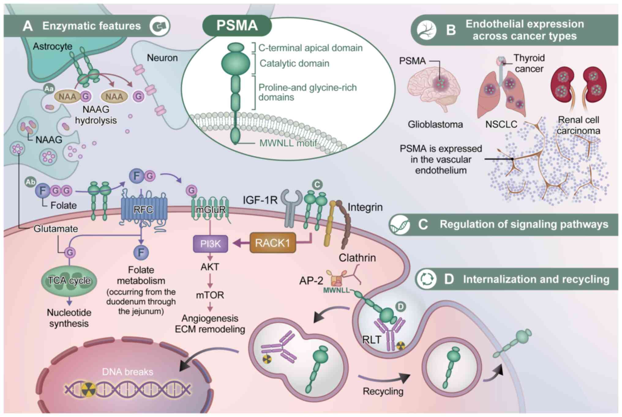 In conclusion, this review revisits PSMA through a unified conceptual framework in which its metabolic enzyme activity, non-enzymatic scaffold signaling, tumor-associated angiogenesis and immunological consequences are functionally interconnected, providing a coherent biological basis for its diverse clinical manifestations and therapeutic potential.