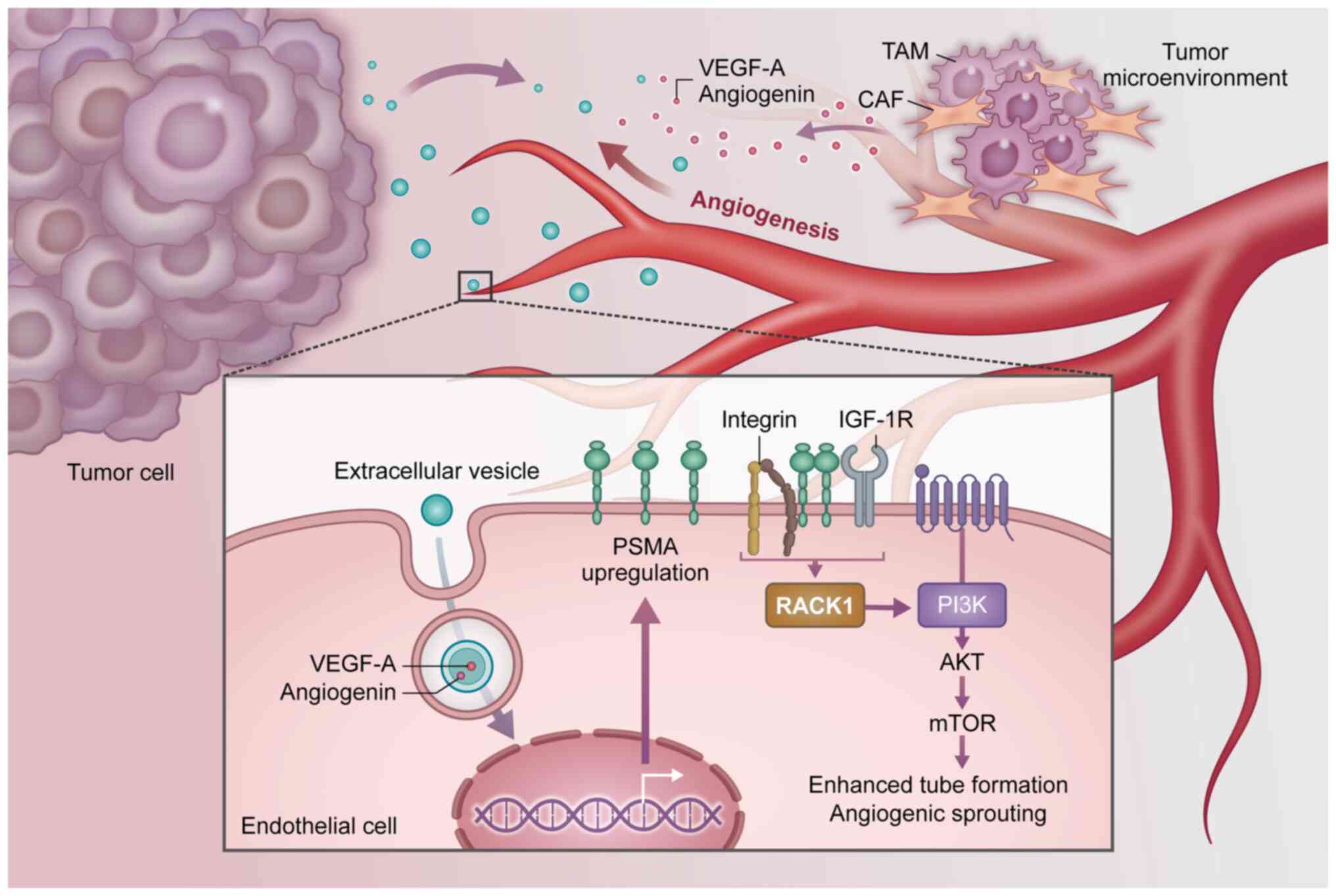 Recent studies have revealed that PSMA is not merely a passive marker but a multifunctional protein involved in glutamate and folate metabolism, clathrin-mediated internalization, potentially in signaling processes that influence tumor progression. Importantly, PSMA expression is not restricted to prostate epithelial cells but can also be found in tumor-associated endothelium across a diverse range of malignancies, including renal cell carcinoma, colorectal cancer and glioblastoma (3,4). This endothelial expression profile implicates PSMA in angiogenesis and tumor microenvironment (TME) remodeling. Consistent with this, paracrine mechanisms have been proposed in which PSMA-positive extracellular vesicles (EVs) or membrane fragments induce PSMA expression in endothelial cells to enhance angiogenesis, suggesting a positive feedback loop for reinforcing tumor vascularization (5). Additional evidence from renal cell carcinoma and other urological malignancies further supports the concept of PSMA as a pan-tumor neovascular marker (6).