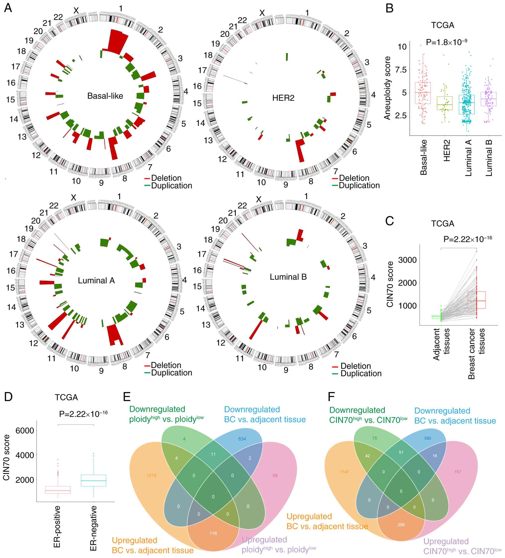 Genomic CNVs, comprising both amplifications and deletions, across different BC types, including luminal A, luminal B, basal-like and HER2 positive types, were analyzed based on TCGA datasets. As shown in Fig. 1A, BC tissues showed different levels of CIN based on the distributions of CNVs. Chromosomal deletions were more frequent compared with that of chromosomal amplifications (Table SI). The specific patterns of gene amplification or deletion varied, in which basal-like subtypes displayed the most frequent CNVs, while of the other subtypes, HER2-type BC exhibited the lowest number of CNVs (Fig. 1A). A total of 55 genes were identified to have been significantly amplified in the genomic data and showed diverse segmental changes among different subtypes, while 96 genes were significantly deleted. Among these regions, the 1q21.3 duplication (dup), 9p21.3 deletion (del), 19p13.3del and 13q12.11del regions were the most frequent loci of CNV in these four subtypes; the genes lying within these regions included cyclin dependent kinase inhibitor 2A (CDKN2A), fibroblast growth factor 9 and human-microRNA-4257/1909/4321 (Table SI).