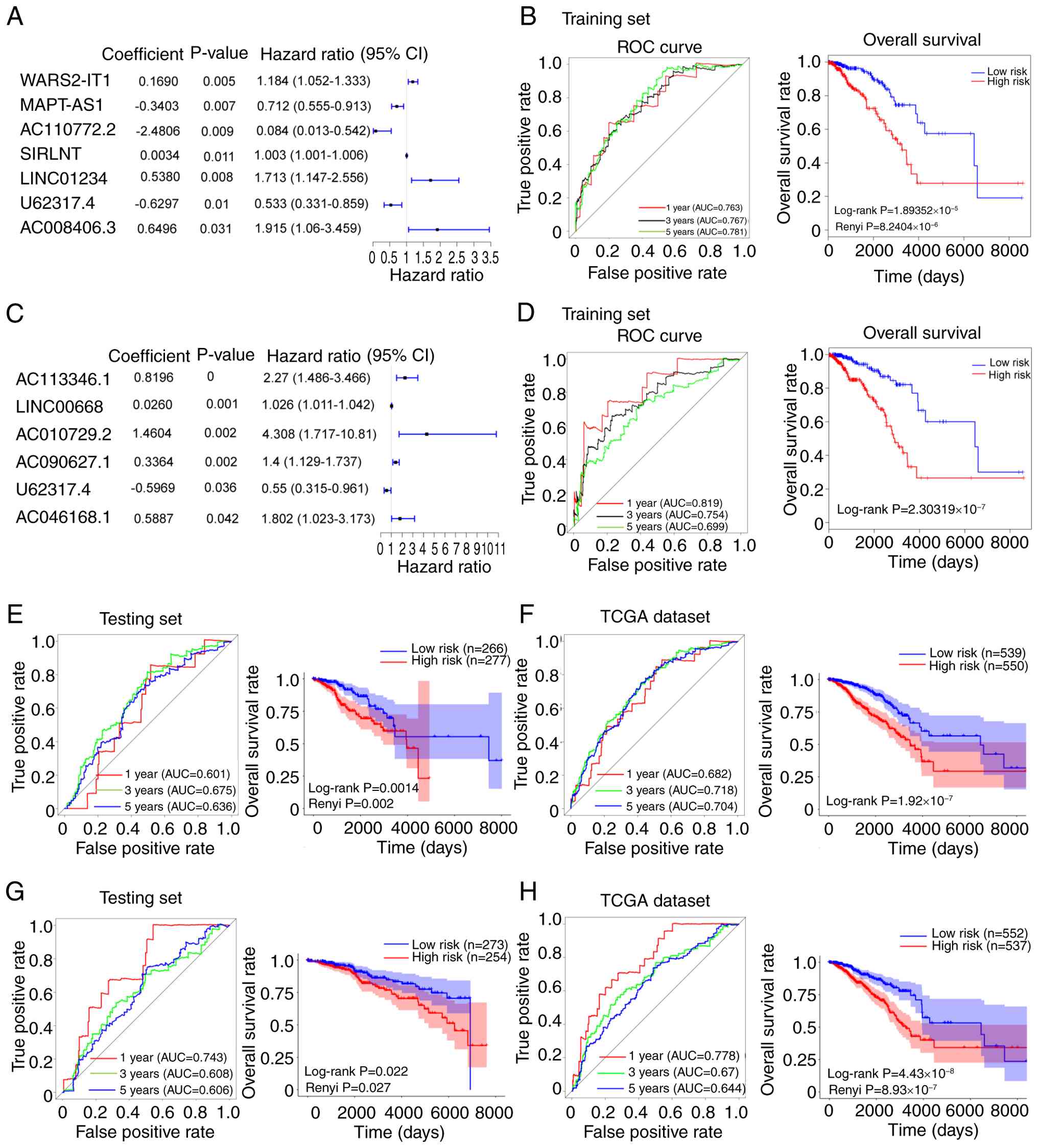To determine the accuracy of the CIN-lncRNASig predictive model, its prognostic performance was validated in the testing and TCGA cohorts used. For the CIN70-related lncRNA prognostic model, ROC analysis showed that the AUC values for 1-, 3- and 5-year survival were 0.601, 0.675 and 0.636, respectively in the testing cohort, whereas these values were observed to be 0.682, 0.718 and 0.704, respectively in the entire TCGA cohort (Fig. 2E and F). Survival analysis showed that the low-risk group displayed significantly higher OS rates compared with the high-risk group in both the testing cohort (Renyi P=0.002; Fig. 2E) and entire TCGA cohort(log-rank P<0.001; Fig. 2F). For the AS-related lncRNA prognostic model, KM analysis also revealed that OS rates in the high-risk group were significantly lower than in the low-risk group within both the testing cohort (Renyi P<0.001; Fig. 2G) and the entire TCGA cohort (Renyi P<0.001; Fig. 2H). ROC analysis demonstrated that the AUC values for 1-, 3- and 5-year survival were 0.743, 0.608 and 0.606, respectively in the testing cohort (Fig. 2G) and 0.778, 0.670 and 0.644, respectively in the entire TCGA cohort used (Fig. 2H).