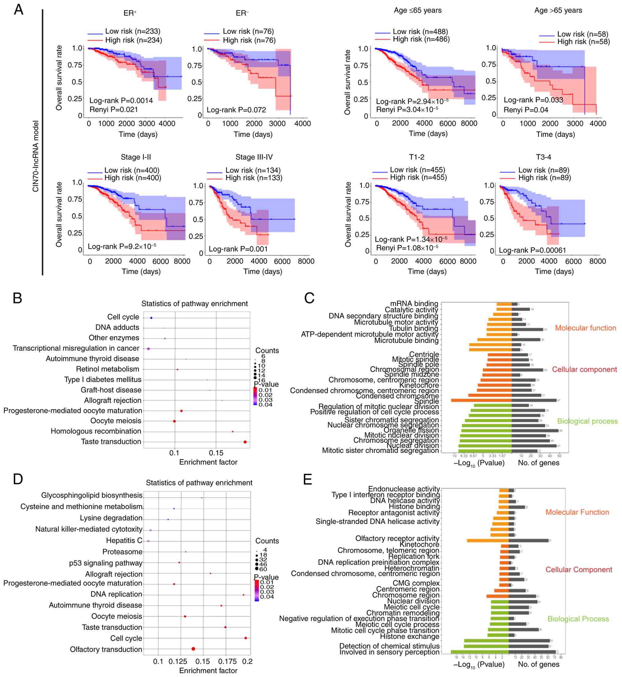 To evaluate the potential independence of CIN-lncRNASig as a prognostic factor, the present study performed a multivariate Cox regression analysis on clinical parameters of BC, including ER status, age, pathological stage and the CIN-lncRNASig predictive model. Patients with BC were divided into ER+ (n=467) and ER− groups (n=152), ages ≤65 (n=974) and >65 (n=116), and groups containing clinical stages I–II (n=800) and III–IV (n=267). Patients within each group were stratified by the median risk score (low risk < median ≥ high risk) into high- and low-risk groups. There was a significant difference in OS rate observed between the two risk groups in patients with ER+ BC (Renyi P<0.05); however, this difference was not significant between the ER− groups (log-rank P>0.05). The OS rates of high-risk groups for other factors, including age, clinical stage and tumor stage, were significantly lower than that of the low-risk groups (log-rank P<0.05 or Renyi P<0.05; Fig. 3A). Furthermore, in the AS-related lncRNA-signature model, the differences in OS between the high- and low-risk groups for these factors were markedly consistent with those observed in the CIN-lncRNASig model (log-rank P<0.05 or Renyi P<0.05; Fig. S1J). However, the difference between the ER− groups in this model was significant (log-rank P<0.05), while no significant difference was observed between risk groups for patients aged >65 years (Renyi P>0.05; Fig. S1J). Therefore, these results indicated the efficiency of CIN-lncRNASig in predicting clinical characteristics within BC cohorts.