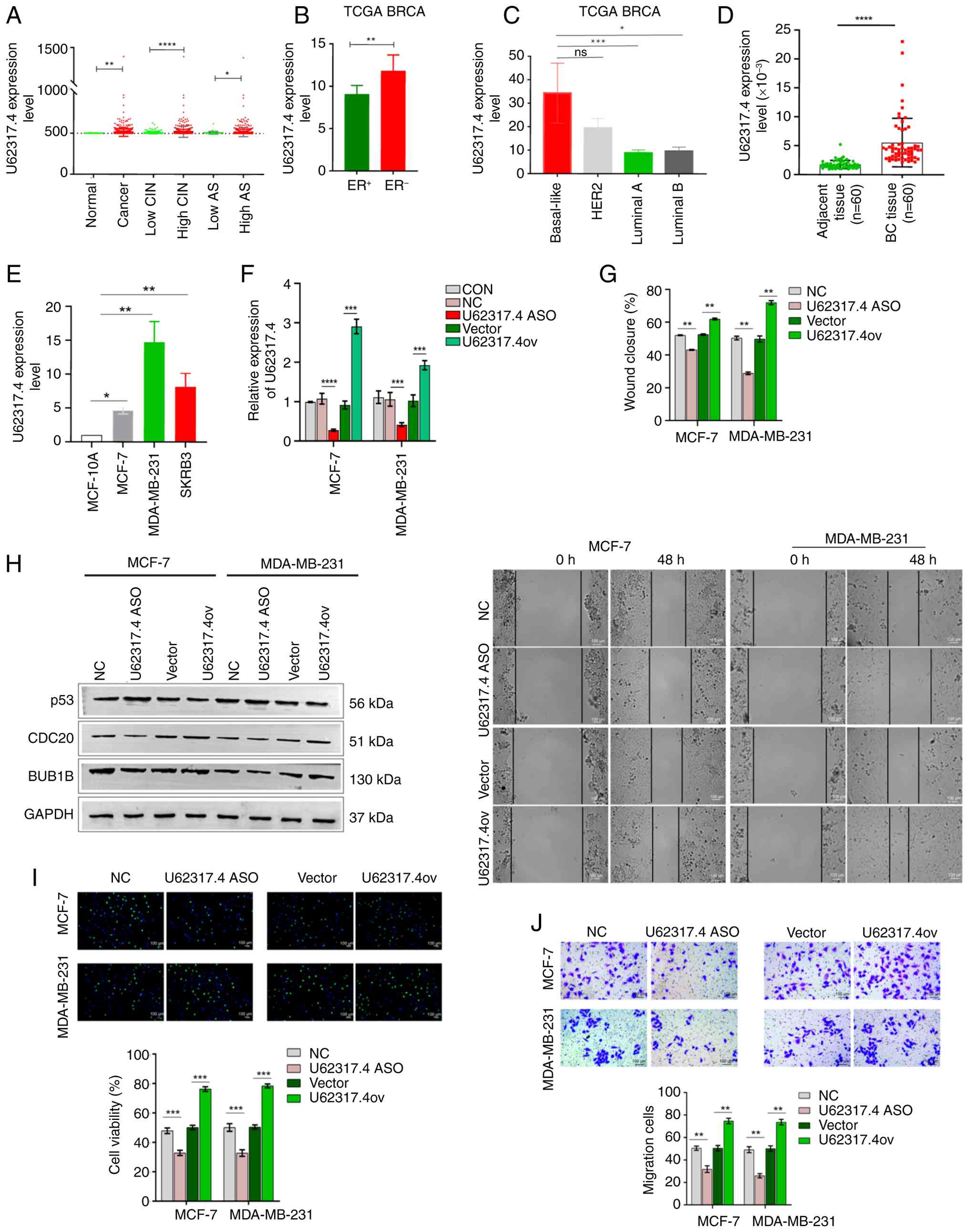 To validate these findings in different cell lines and in the collected patient samples, BC tissues displayed a significantly higher expression level of U62317.4 than adjacent tissues (Fig. 4D). The expression level of U62317.4 was significantly higher in BC cells compared with epithelial cells, especially in the MDA-MB-231 cell line, comprising basal-like TNBC cells (Fig. 4E). Compared with controls, the expression of U62317.4 in MCF-7 cells, which are ER+, PR-positive luminal BC cells, and MDA-MB-231 cells was significantly reduced after transfection with ASOs, while U62317.4 expression was significantly increased after transfection with U62317.4 overexpression plasmids (Fig. 4F). Silencing U62317.4 significantly suppressed cell viability (Fig. 4I), wound-healing ability (Fig. 4G) and migration in BC cells (Fig. 4J). In addition, expression of the apoptosis-related protein p53 was notably promoted after U62317.4 knockdown (Figs. 4H and S2F and G), while CDC20 and BUB1B expression showed marked decreases after U62317.4 was silenced. On the contrary, U62317.4 overexpression promoted BC cell viability, proliferation and migration (Fig. 4I and J), as well as BC cell line wound closure (Fig. 4G). BUB1B and CDC20 protein levels were markedly increased following U62317.4 overexpression while p53 protein expression significantly decreased (Figs. 4H and S2F and G). These findings suggested that U62317.4 acted as an important regulator of tumorigenesis.