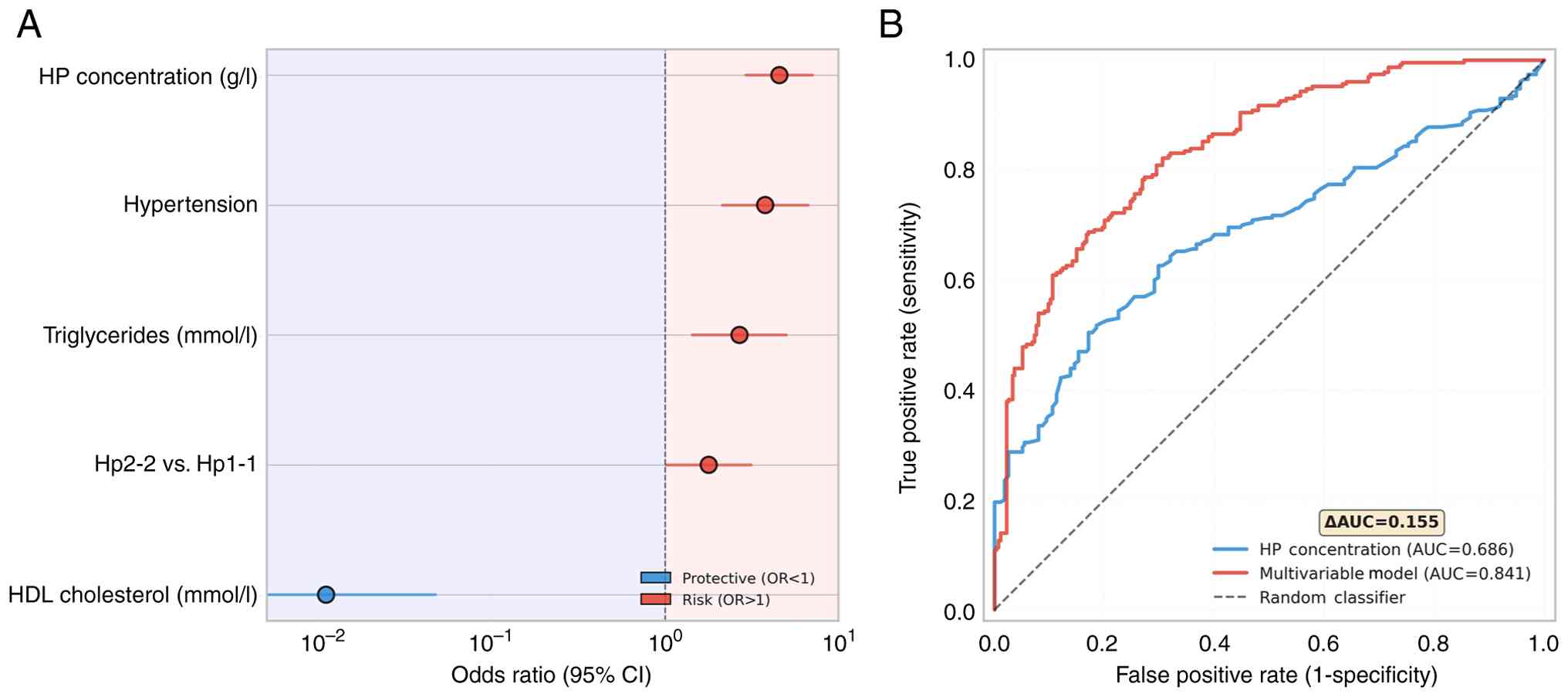 Visualization by forest plot demonstrated the magnitude and direction of associations for the previously identified significant predictors of CAD, with HP concentration and hypertension showing the strongest positive associations with CAD risk, whereas HDL-C levels demonstrated the most pronounced protective effect (Fig. 1A). ROC curve analysis demonstrated the superior discriminative ability of the multivariate model (AUC=0.841) compared with HP concentration alone (AUC=0.686), representing a clinically meaningful improvement of 0.155 in AUC value (Fig. 1B). The multivariate model achieved good discriminative performance, indicating its potential clinical utility for the assessment of CAD risk.