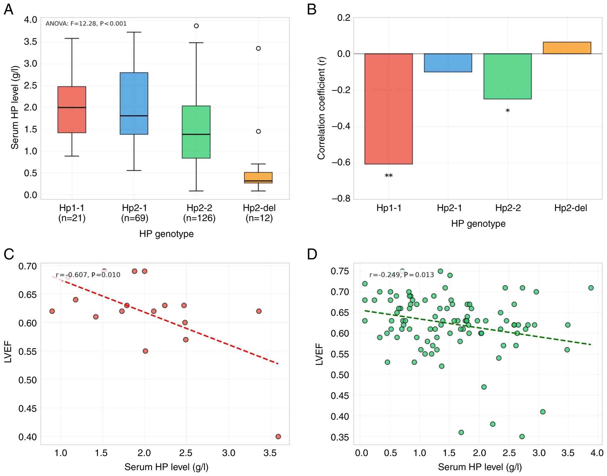 Genotype-stratified correlation analysis revealed distinct patterns of association between HP levels and cardiac function (Fig. 2B). In the Hp1-1 group (n=17), serum HP concentration showed a moderate negative correlation with LVEF (r=−0.607; P=0.010), explaining 36.8% of the variance in cardiac function (Fig. 2C). Similarly, the Hp2-2 group (n=99) demonstrated a notable negative correlation with cardiac function (r=−0.249; P=0.013) (Fig. 2D). By contrast, Hp2-1 and Hp2-del genotypes showed no significant associations with LVEF (P>0.05).
