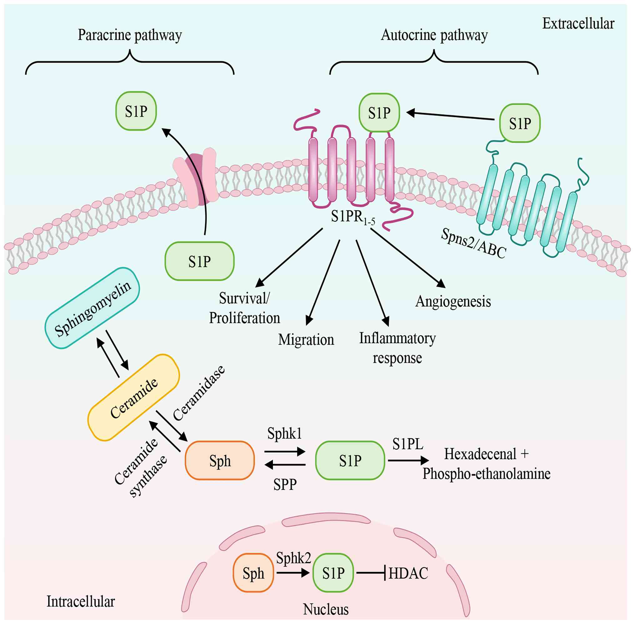 Cellular S1P levels are maintained by a tightly regulated dynamic balance between its synthesis and degradation. S1P degradation proceeds via two principal pathways: Reversible dephosphorylation back to Sph by S1P phosphatases (SPP) and irreversible catabolization to hexadecenal and phosphor-ethanolamine by S1P lyase (S1PL) (18–20). In tissues, low S1P concentrations are maintained due to efficient degradation by S1PL. By contrast, erythrocytes and platelets lack S1PL, resulting in the high S1P concentration characteristic of blood. S1P mediates signaling through both intracellular and extracellular mechanisms. While its extracellular signaling is well-established, its intracellular roles remain less defined. Intracellularly, S1P can function as a second messenger, directly targeting proteins such as histone deacetylase (HDAC) to influence Ca2+ homeostasis, gene transcription and protein modification (21). S1P can act via autocrine mechanisms or be exported to the extracellular milieu by transporters, including specific ATP-binding cassette (ABC) transporters and spinster homolog 2 (Spns2) transporters. Once extracellular, S1P binds to five S1PRs on the target cell surface, initiating diverse downstream signaling cascades (22–24).