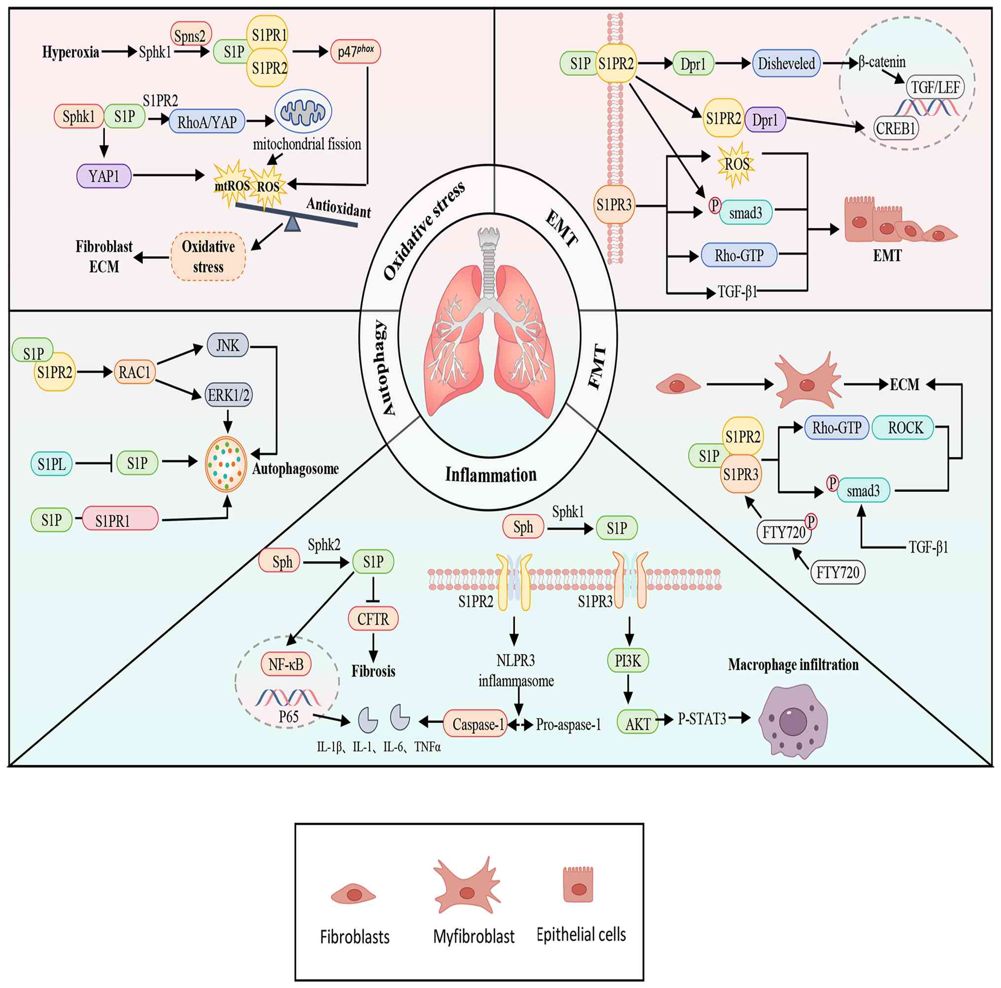 S1P signaling has been extensively investigated in the context of lung diseases. Previous reviews by Ebenezer et al (8) and Mohammed and Harikumar et al (9) summarize the roles of S1P signaling across a broad spectrum of pulmonary disorders, with a primary focus on immune regulation, inflammatory responses and vascular-related functions. By contrast, the present review focusedon pulmonary fibrosis and provides a mechanism-oriented synthesis of recent advances regarding the roles of S1P signaling ininflammation, fibroblast-to-myofibroblast transition (FMT), epithelial-to-mesenchymal transition (EMT), autophagy and oxidative stress, with the aim of clarifying its functional relevance and potential therapeutic implications in pulmonary fibrosis.